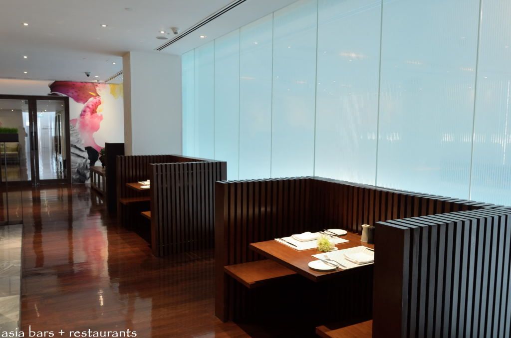 Sleek dark timber booths extend across the translucent glass front wall. The entrance to the COMO Shambhala Spa is in the background.