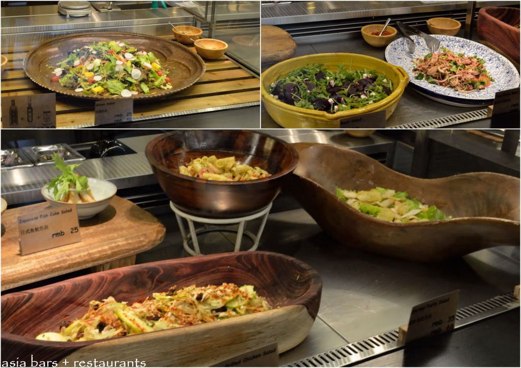 Selection of salads from the salad bar- (Clockwise from top L) Green salad; Beet salad; and Curry Grilled Chicken salad.
