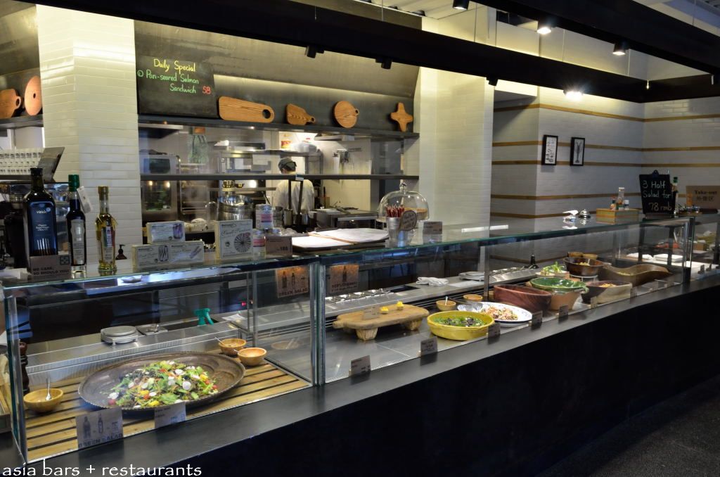 The Deli food display counter and salad bar- with the open-kitchen at the rear.