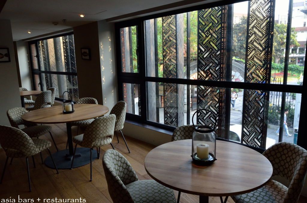 Stylish round table settings are arranged across the window frontage of the restaurant. The perforated patterns of the external metal screens provide an attractive filter to the outside views.