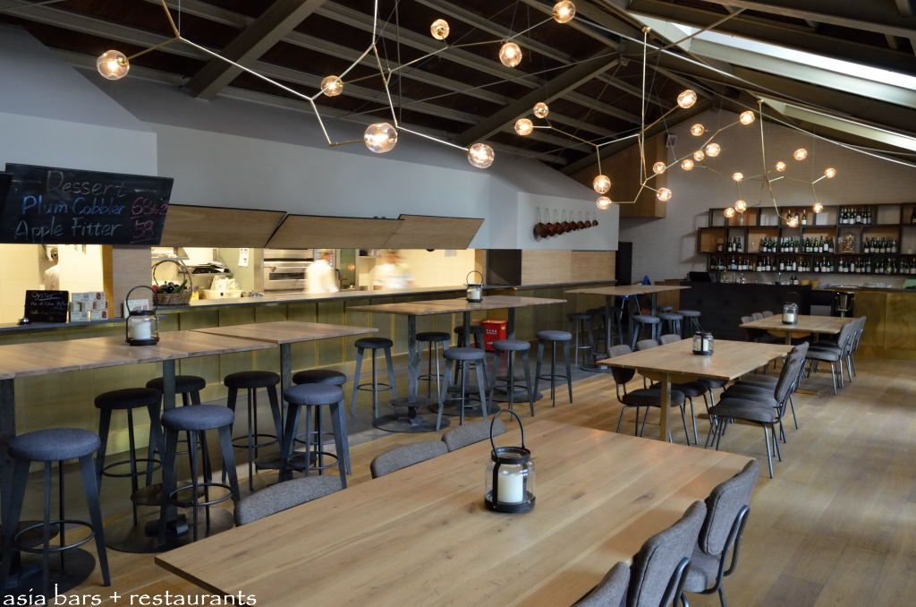 The dining room has an industrial loft style with a vaulted timber ceiling and neutral palette of blond timbers, black and grey furnishings and white walls. The kitchen can be viewed behind the long service counter.