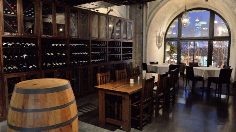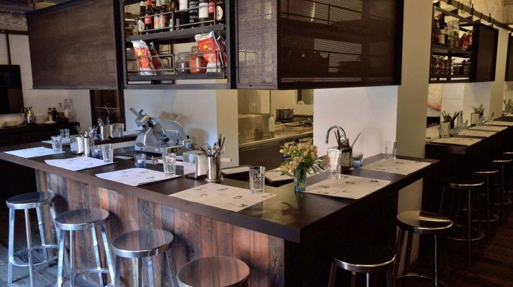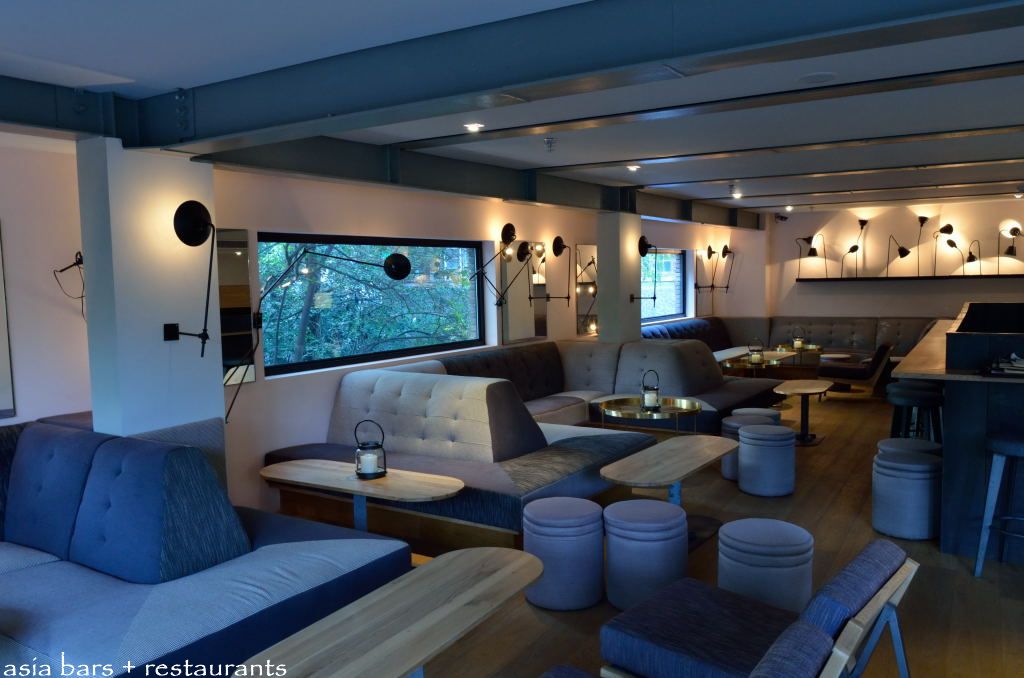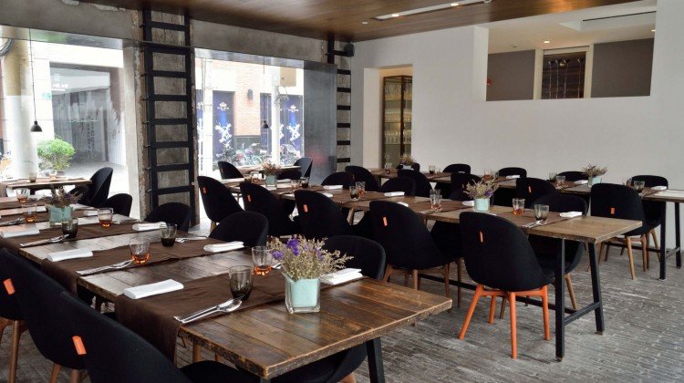 The main dining space of Small Plates features a series of blond timber high tables and grey upholstered stools, and similar tables settings.