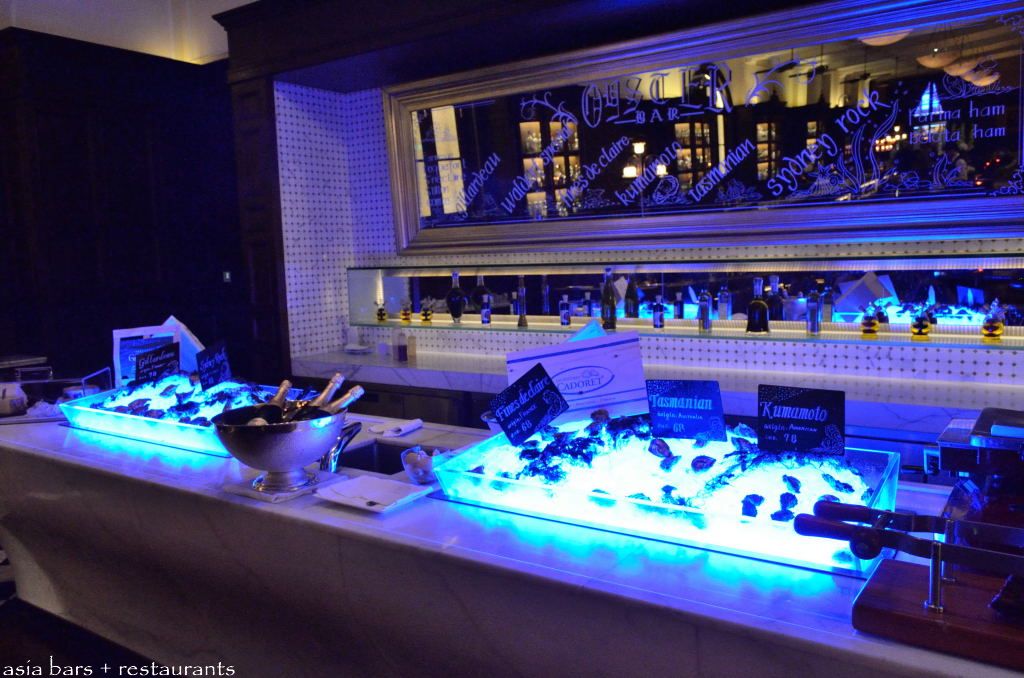 The interior style of the Long Bar is an accurate re-creation of the club bar of the 1920’s and 30’s with the dark mahogany timbers of the bar, wall panelling and cabinetry contrasting with the white ceilings and white marble bar counter top. Overhead, ceiling fans silently circulate the air. The furnishings feature luxurious leather armchairs and sofas, with plush leather and heavy timber bar stools standing along the bar front. The seating at the east end of the room enjoys views framed by the curtained windows overlooking The Bund promenade and Huangpu river. At the opposite, far end of the room, the Oyster Bar is a highlight- showcasing fresh air-flown premium oysters.