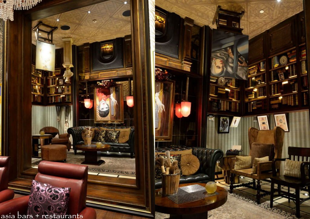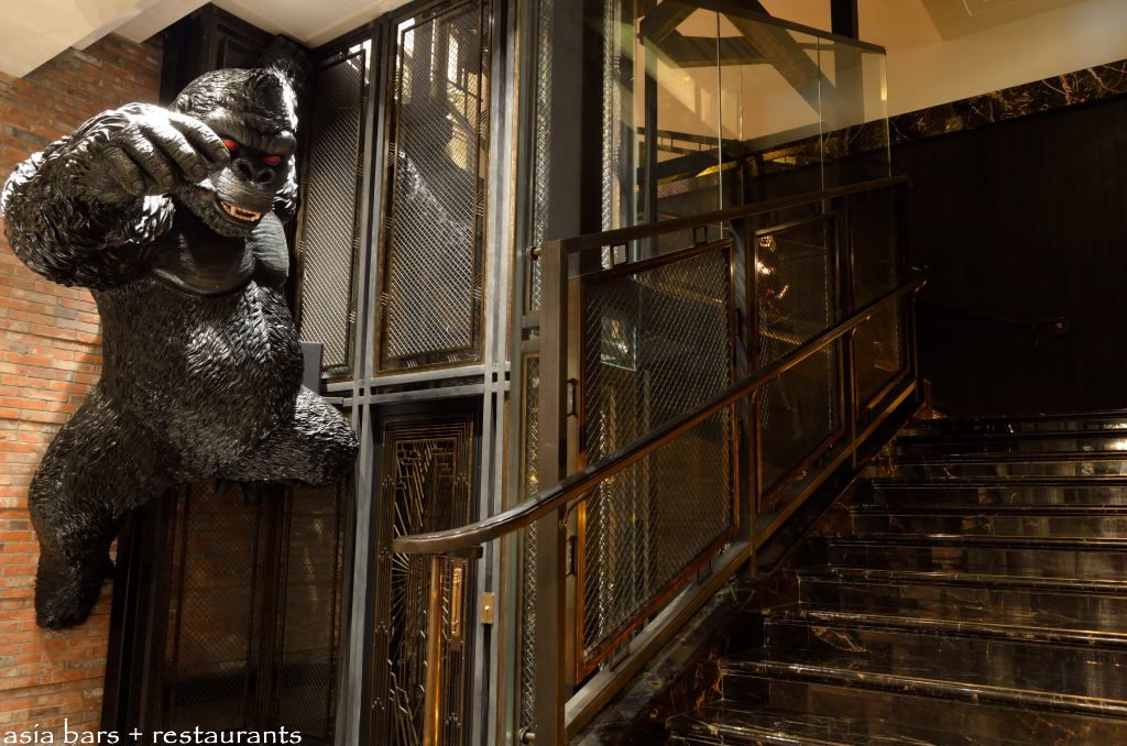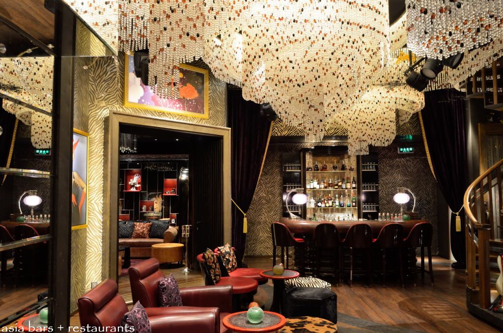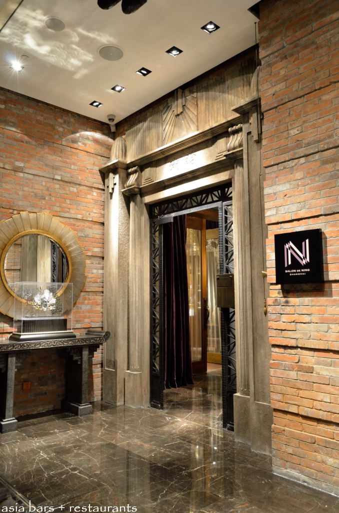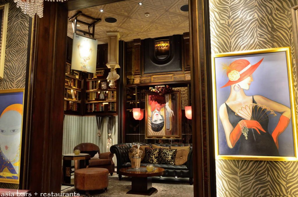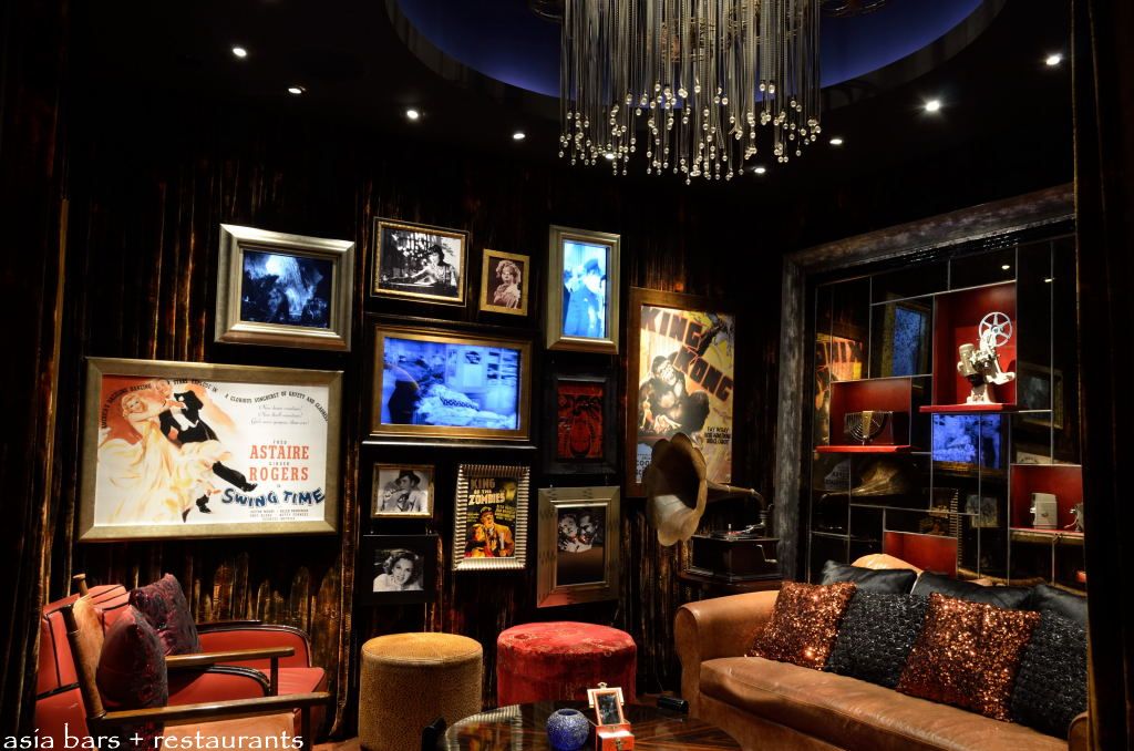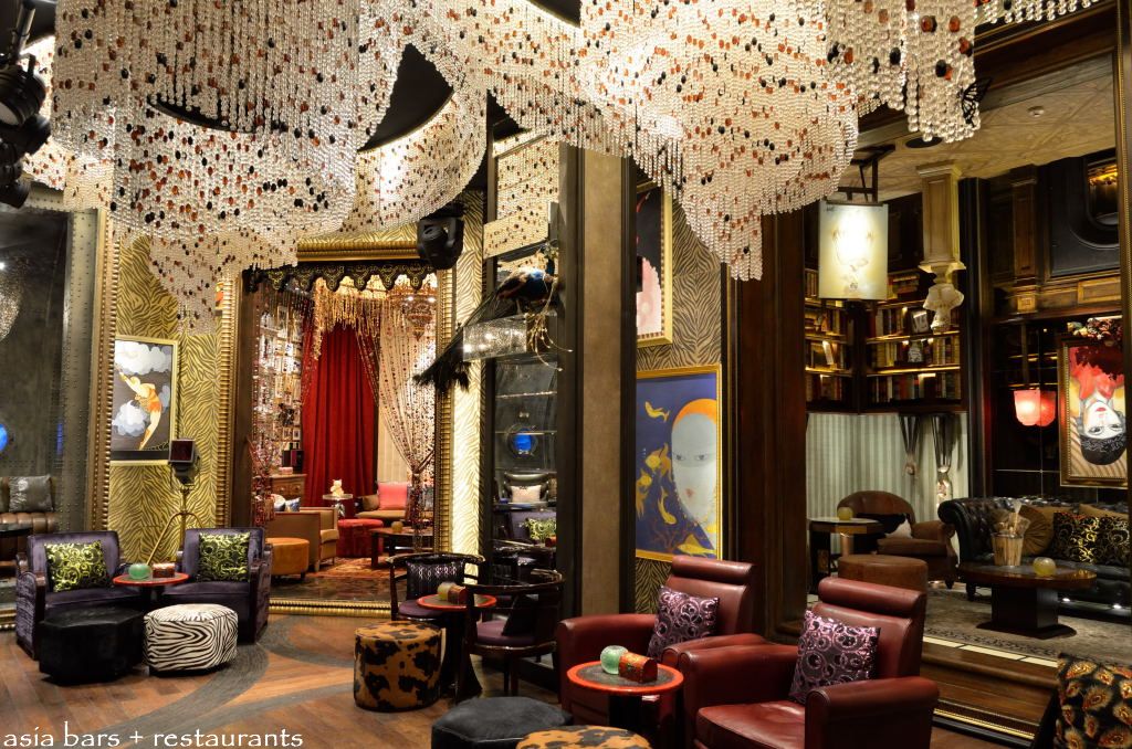 Salon de Ning is located in the basement level of The Peninsula- with access by stairway or antique elevator from The Bund entrance lobby area. After encountering an animated King Kong replica perched above the elevator exit, guests enter through a large granite gate archway featuring Roman and Art Deco door. The interior spaces comprise the main Salon or lounge with the compact cocktail bar located adjacent to the entrance. Around the perimeter of the Salon are four themed rooms- each “framed” with over-sized gilded picture frames.