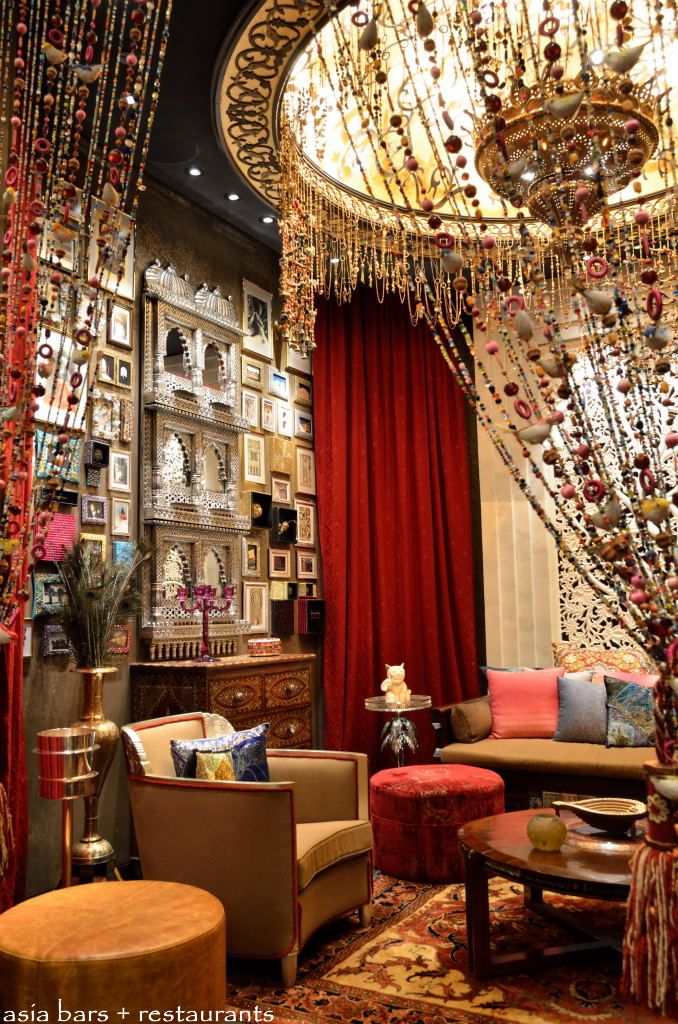 The furnishings of the INDIA room feature intricately beaded curtains, plush carpets,and velvet fabrics.