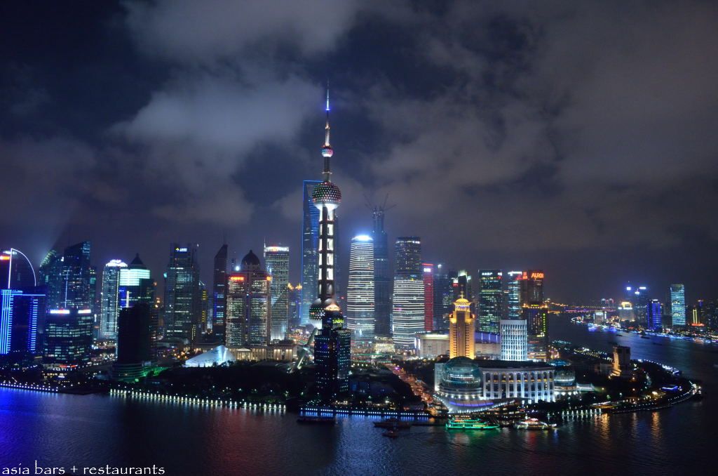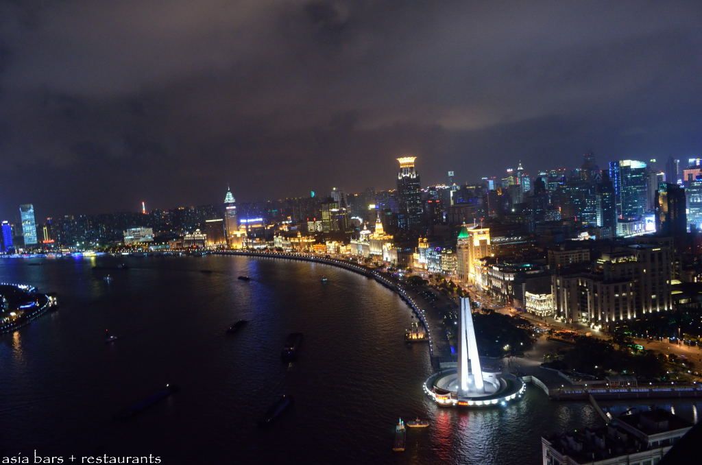 The breath-taking view from the rooftop terrace- one of the best vantage points in Shanghai for panoramic vistas across the broad sweep of the Huangpu River – with The Bund on the right, and the Pudong office district to the left.