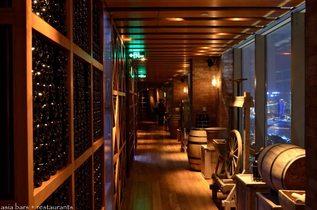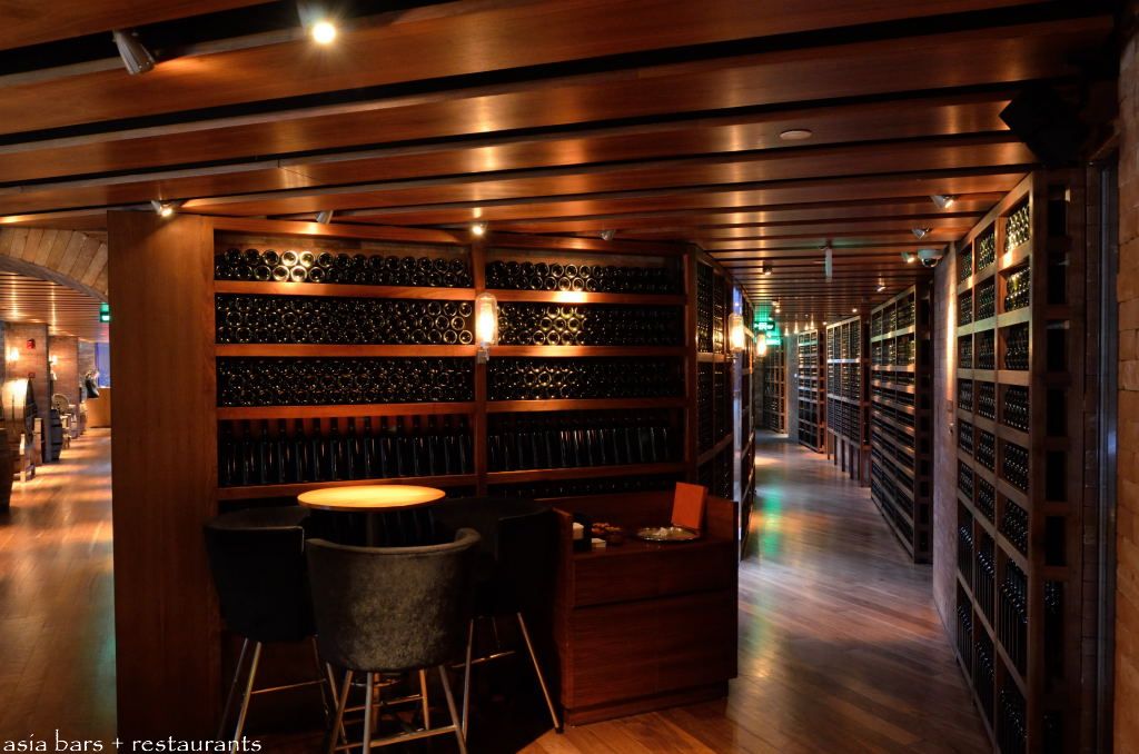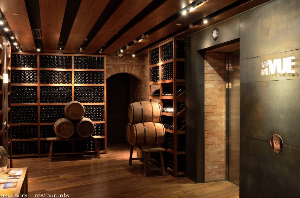 The entrance foyer at VUE is styled as a rustic winery, with raw bricks, timber floors, oak wine casks, and thousands of actual wine bottles stacked into floor to ceiling shelving.