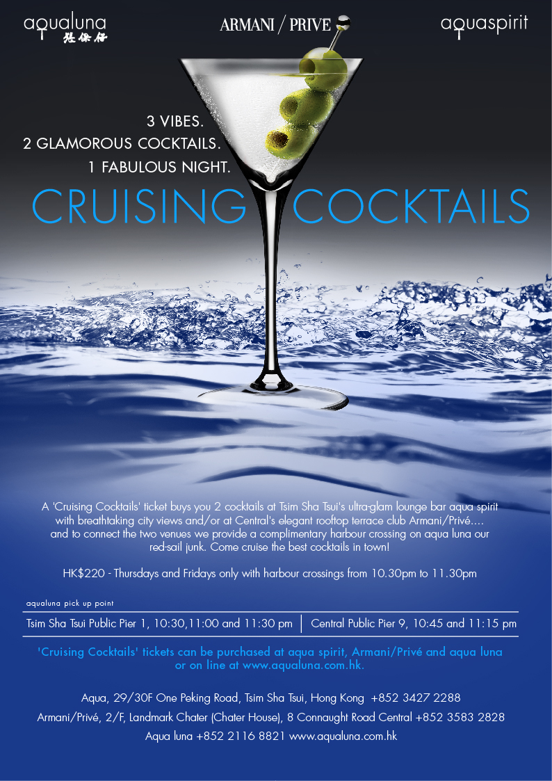 Included in the Cruising Cocktails ticket, priced at HK$220, are two signature cocktails that can be enjoyed either at stylish Armani/Privé or the stunning aqua spirit at One Peking, or one in each, as well as a complimentary aqua luna harbour crossing. The package is designed to make an evening spanning both sides of the harbour both convenient and glamorous.