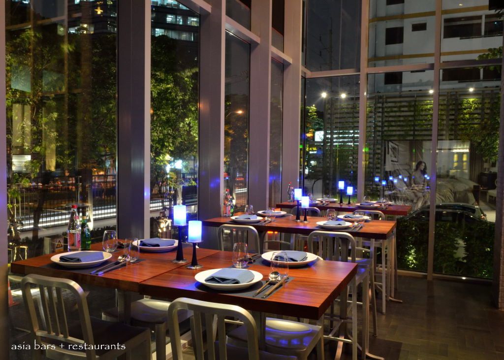 The restaurant is encased by a towering glass facade -enveloping the high tables across the front with the external streetscape.