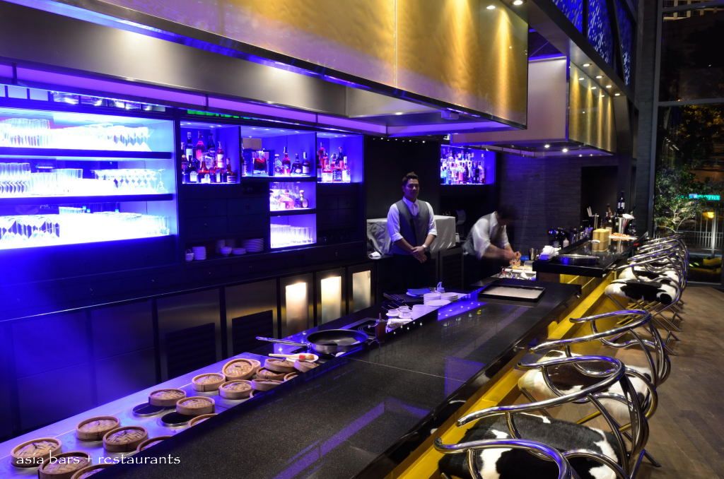 The sleek black long main bar counter with bar seats fashioned from polished stainless steel and cowhide upholstery. The bar showcases the open dim sum kitchen at one end, and towards the front, the cocktail bar.