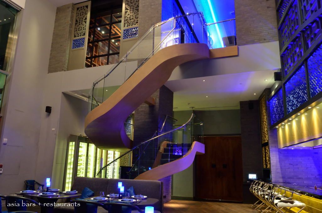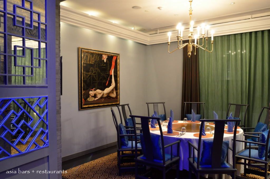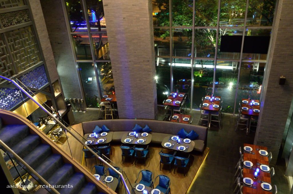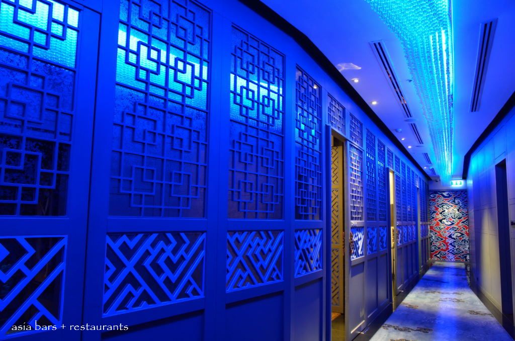 The dramatic interior design blends a modern palette of dark navy blue, black and gold and unpolished timber floors with traditional Chinese elements such as the patterned panelling and intricate timber screens. The entire screened wall behind the bar illuminates in color changing sequences suffusing the room with hues ranging through blues, yellow and red. With its soaring ceiling the main room has an impressive sense of spaciousness, and the floor to ceiling glass soaks up the street lighting as it filters through the green canopy of the tree-lined roadway, providing an atmosphere of calmness and relaxation.