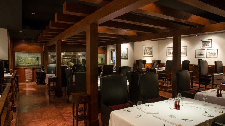 An upper level section of private dining rooms is accessed by a spiral staircase that wraps around a central pillar.