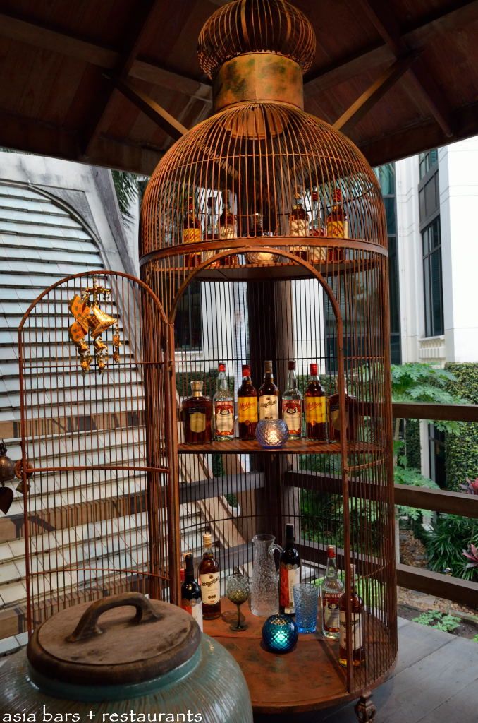 An antique wire birdcage has been transformed into the liquor bottle display.