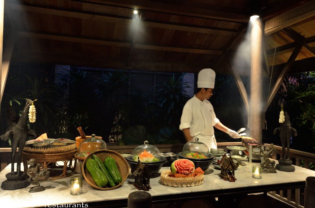 The Thiptara ( Thai meaning “River from Heaven”) restaurant serves dinner only, with a seating capacity limited to 68 guests. Set within an enclosed garden compound, with four antique teakwood salas, and riverfront terrace tables, there is a pervasive sense of serenity and gracious hospitality as if dining in a private residence. Clustered around a grand old banyan tree, the individual salas offer small groups of diners the serendipity of both privacy and wonderful views out over the riverbank. For diners preferring an absolute riverfront experience, the generously spaced tables at the riverbank terrace suffuse the senses with the sights, sounds, and aromas of the fast- flowing river.