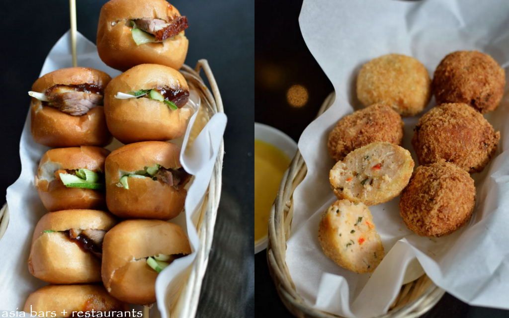 Bar Snacks- (L) Peking Duck with Deep Fried Mantou Bun with hoisin sauce; and (R) Salmon Crab Cake with mango and chili mayo dip.