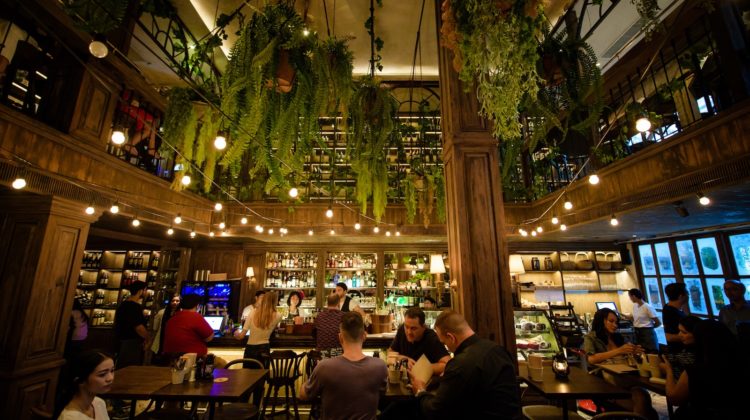 The indoor bar section features a series of high tables and a long wooden bar counter lined with bar stools.