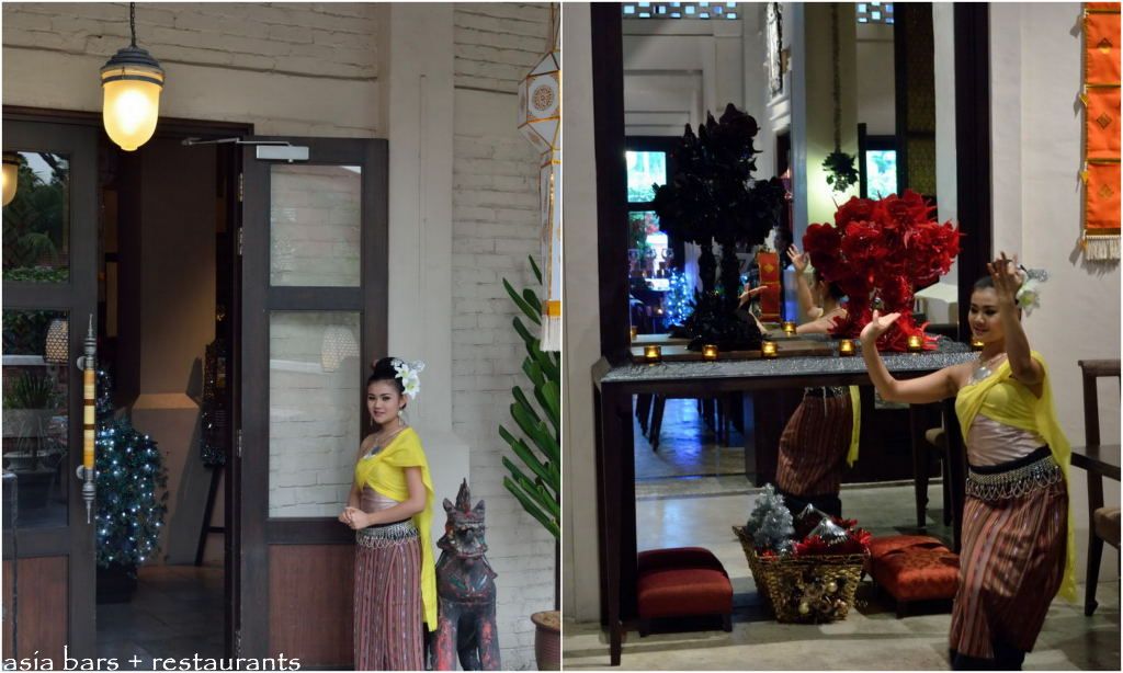 Graceful Thai dancers in traditional attire greet guests and perform unobtrusively within the main dining room.