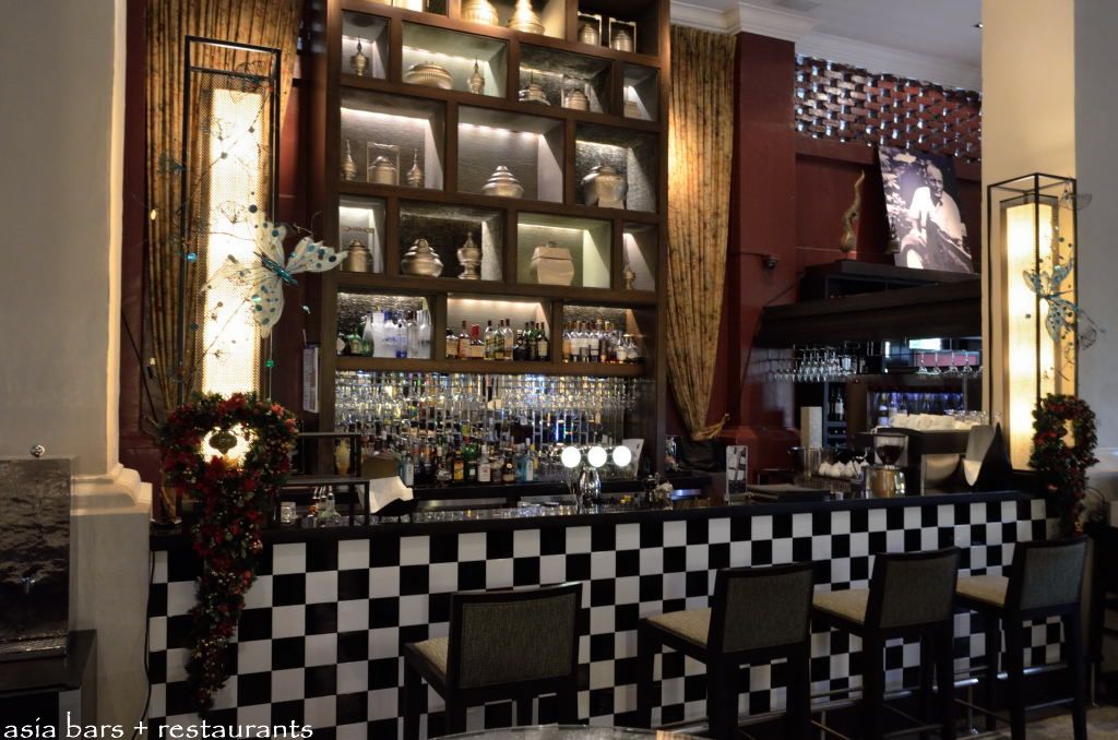 The bar counter has a contemporary design with a bold black and white chequered decoration. Shelving behind the bar showcases numerous authentic Thai artifacts.
