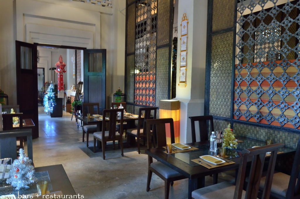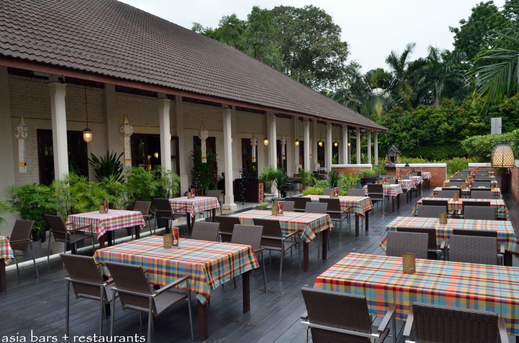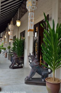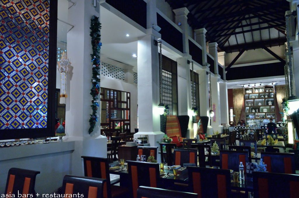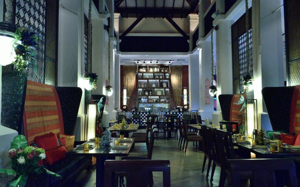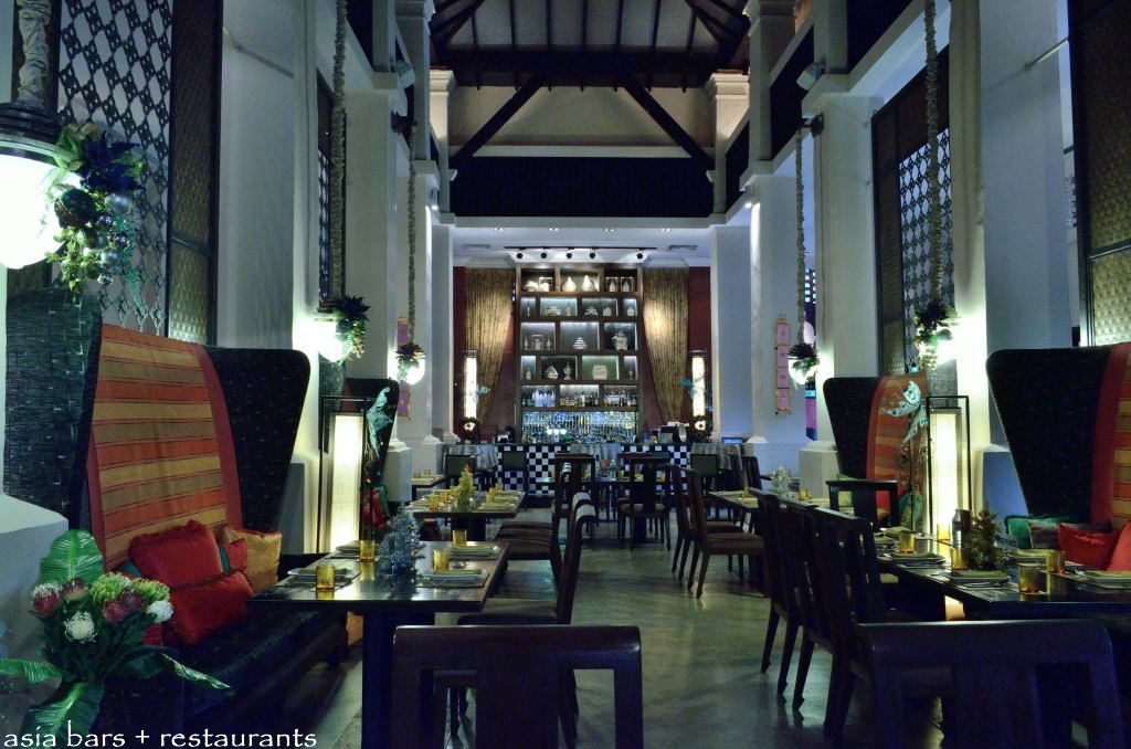 The main dining hall features a eminently stylish blend of traditional architecture with contemporary furnishings. In the central section of the dining floor space a series of high-backed banquettes, with colorful Thai silk textile coverings make a boldly elegant statement.
