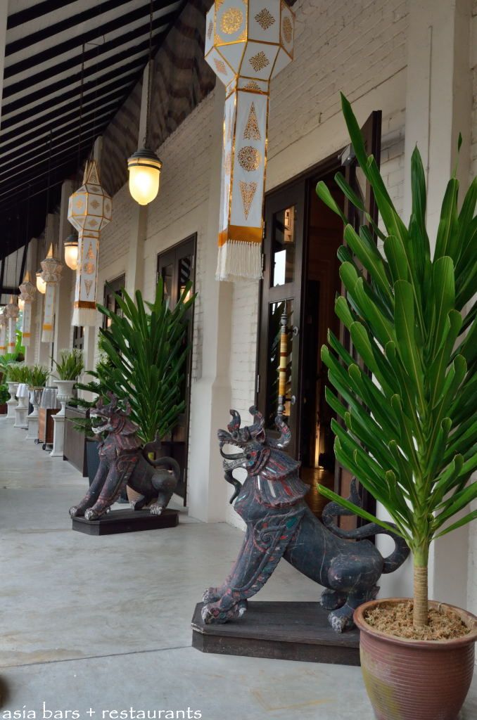 Nestled among the lush greenery of the historic Dempsey Hills area of Singapore, the complex of grand colonial-era buildings that once functioned as the main military barracks for the British Army in Singapore have been extensively restored and converted into a thriving upscale lifestyle complex of restaurants, antique stores, and art galleries. In one of the more prominent heritage buildings near the main entrance to the complex, the globally renowned Thai silk and textile company- Jim Thompson– established their flagship Thai restaurant in 2009 – the acclaimed Jim Thompson Thai Restaurant & Wine Bar. Drawing on decades of design experience and the cultural heritage of the famous Jim Thompson Residence and Museum in Bangkok, the company have created a magnificent statement of restaurant design- artfully combining the impressive colonial architecture with a contemporary Thai style of refined elegance.