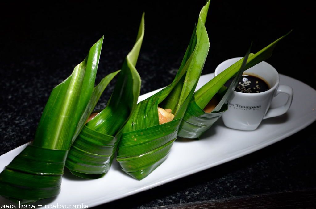 Gai Hor Bai Toey- Marinated chicken wrapped in pandan leaves, deep fried and served with special Thompson dip.