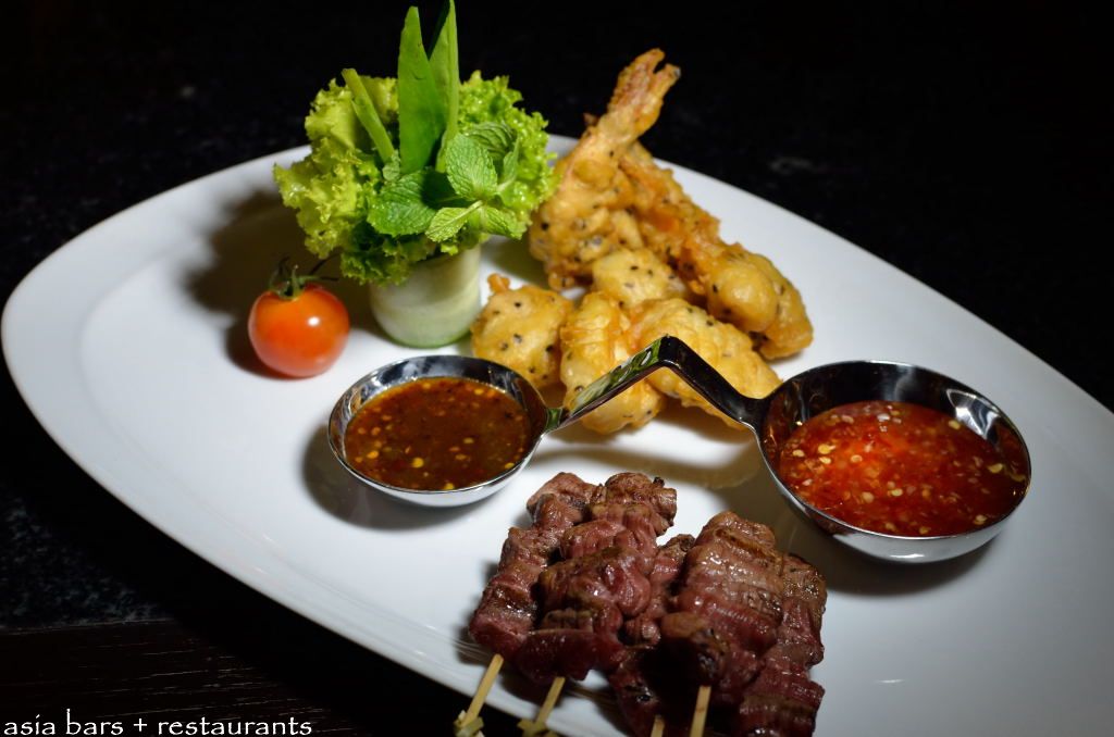 Pattaya Set – A selection of battered fish, prawn and scallop with grilled beef, accompanied with a bowl of Yam Som O Boran (A variation of traditional pomelo salad with shredded chicken, roast garlic, minced shrimp in creamy coconut dressing)