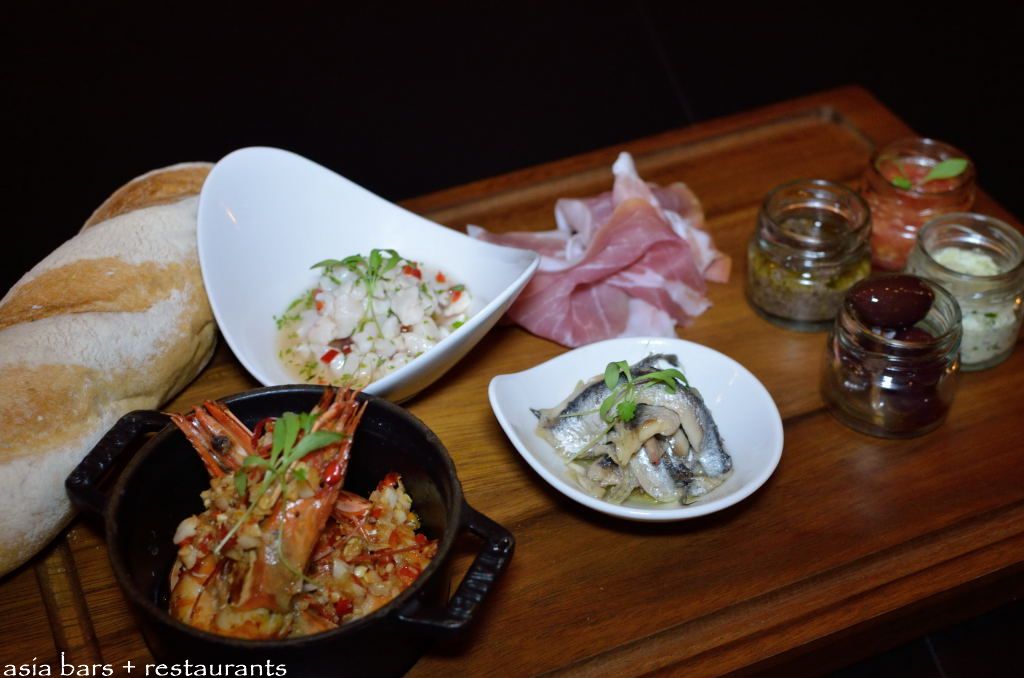 Assorted Tapas- (L to R) Gambas al Ajillo; Scallop Ceviche; Boquerones; Parma Ham.