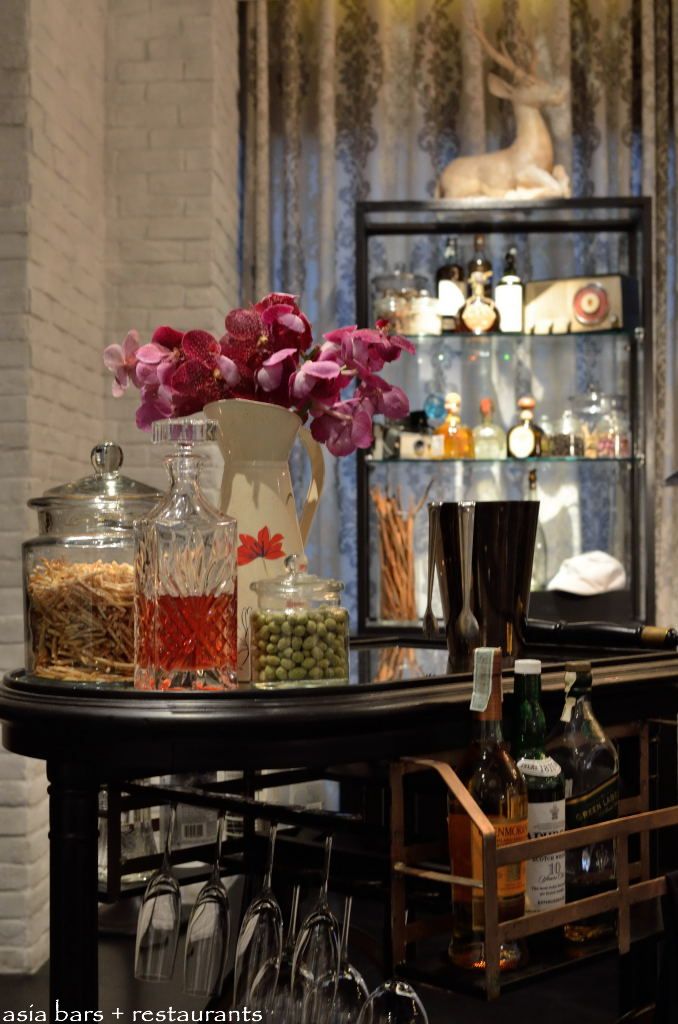 An antique drinks trolley provides a table-side drinks service platform for guests.