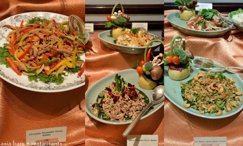 Popular Asian salad dishes- L to R: Chinese Roasted Duck Salad; Thai Spicy Minced Pork Salad; Thai Spicy Wing Bean Salad.