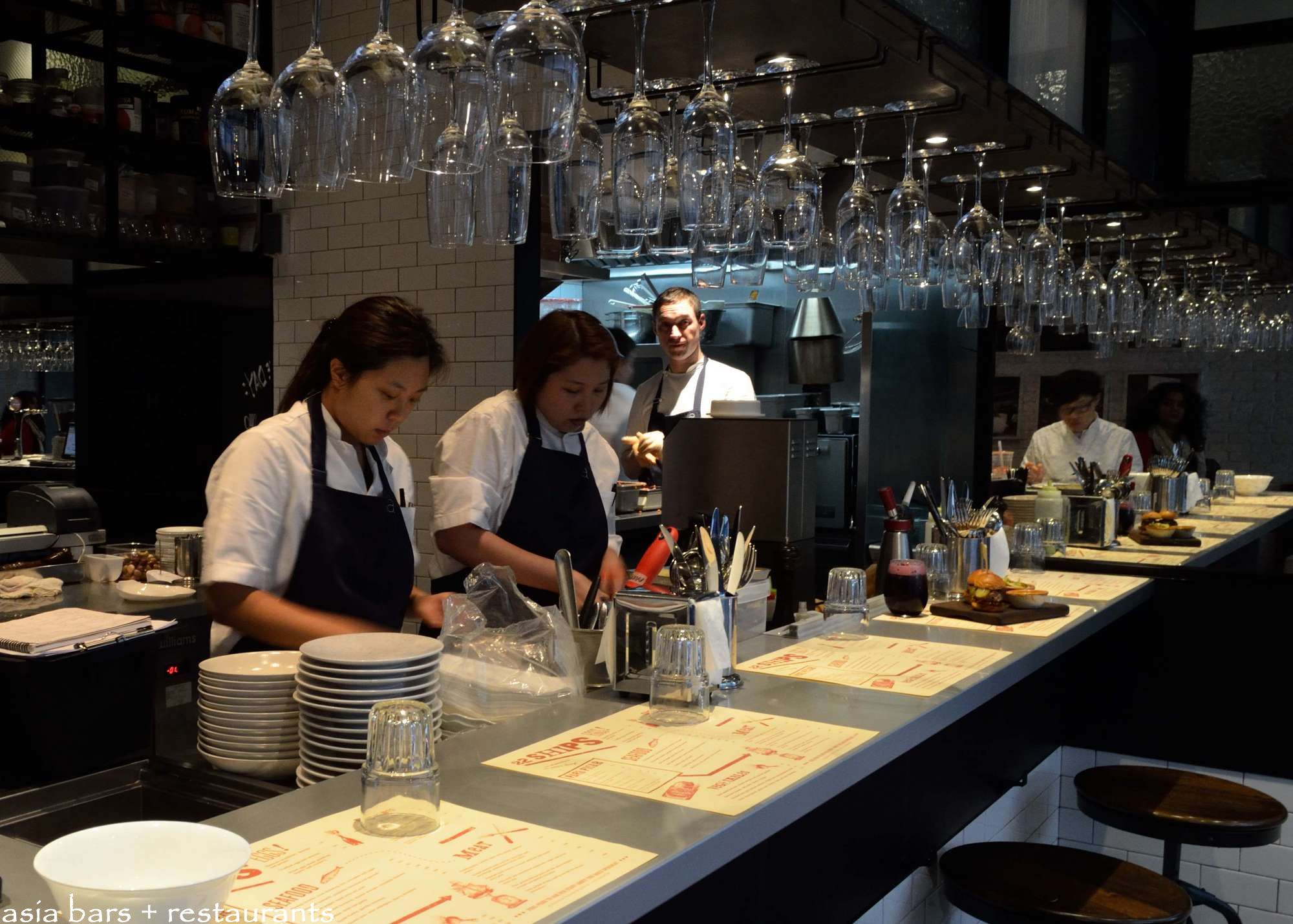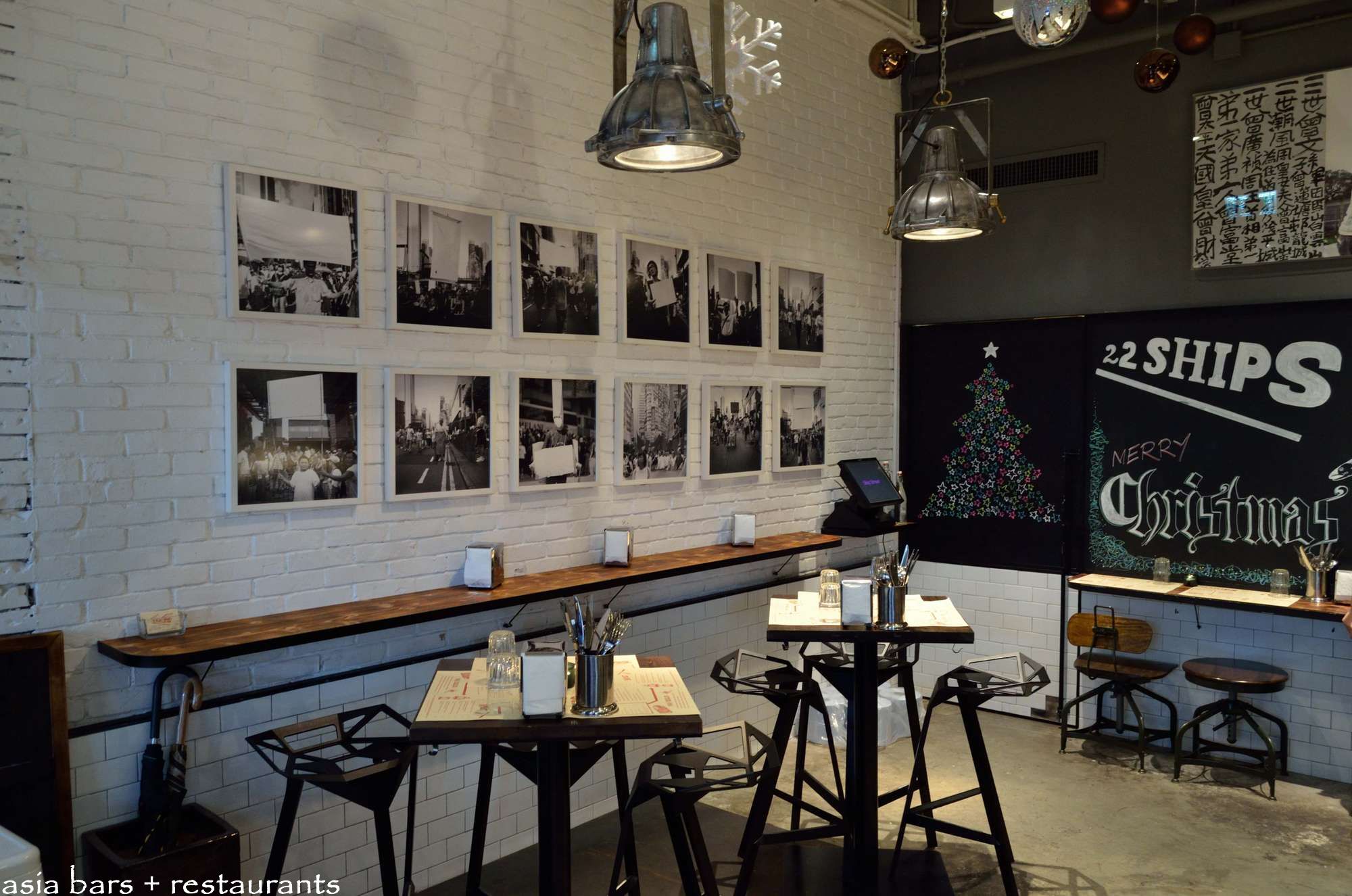 Located on Ship Street, a small side street in the post- industrial area of central Wanchai now undergoing accelerated urban renewal- the restaurant presents an open facade to the pavement and exudes an industrial chic design ethos with a minimalist decor of whitewashed brickwork, concrete flooring, exposed ceiling ductwork, recycled timber benches and stainless steel counter tops. Windows across the frontage fold back to open up the interior to the outside street- with open air seating at the pavement side benchtop. In the evenings the pavement space outside 22 Ships becomes a buzzing social hub as diners either wait for tables or enjoy an after-dinner drink.