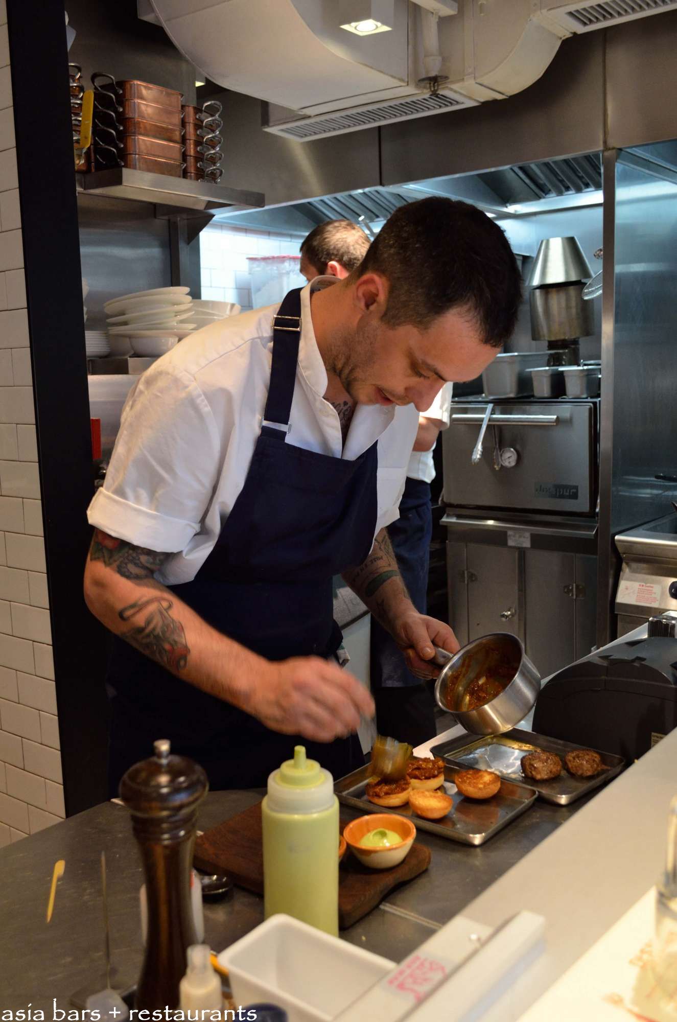 Executive Chef Matt Bishop preparing a plate of the popular Char grilled Ibérico pork and foie gras burgers.