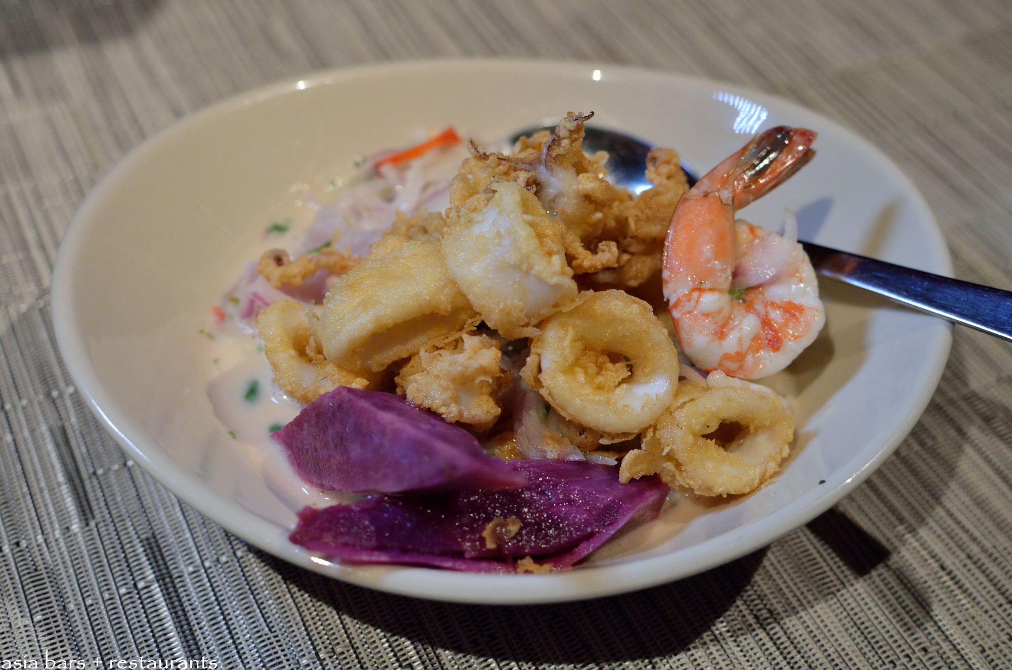 APPETIZER: Cebiche Above Eleven- Seabass and Prawns marinated in Leche de Tigre and red chili criolla, topped with deep fried calamari, with orange glazed sweet potatoes.
