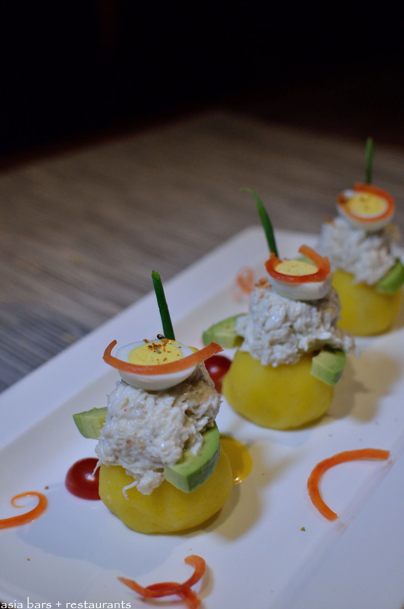 APPETIZER: Causa Kani- Mashed potatoes mixed with yellow chili and lime juice, topped with crab meat in togarashi mayo, avocado , quail egg and Huancaina sauce.