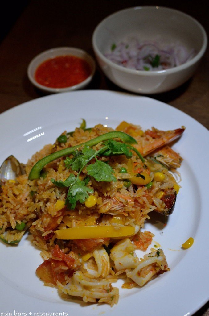 MAIN COURSE: Arroz Con Mariscos- Traditional Peruvian yellow chili flavoured rice dish, with pan fried prawns, squid, clams & mussels. Served with salsa Criolla.
