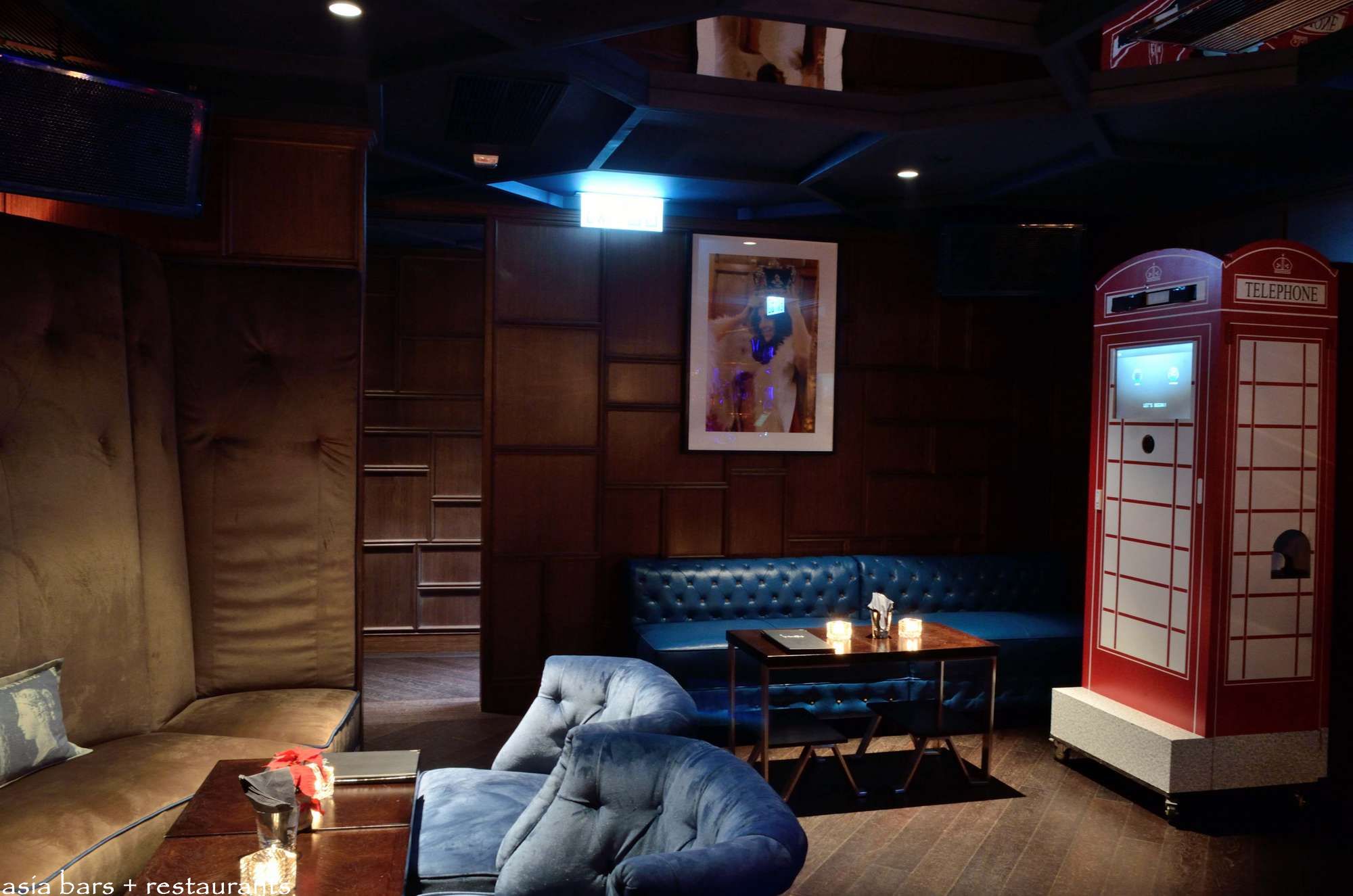 Eclectic references to “Britishness” include the red phone booth near the entrance, and cushions with vintage postage stamp images.