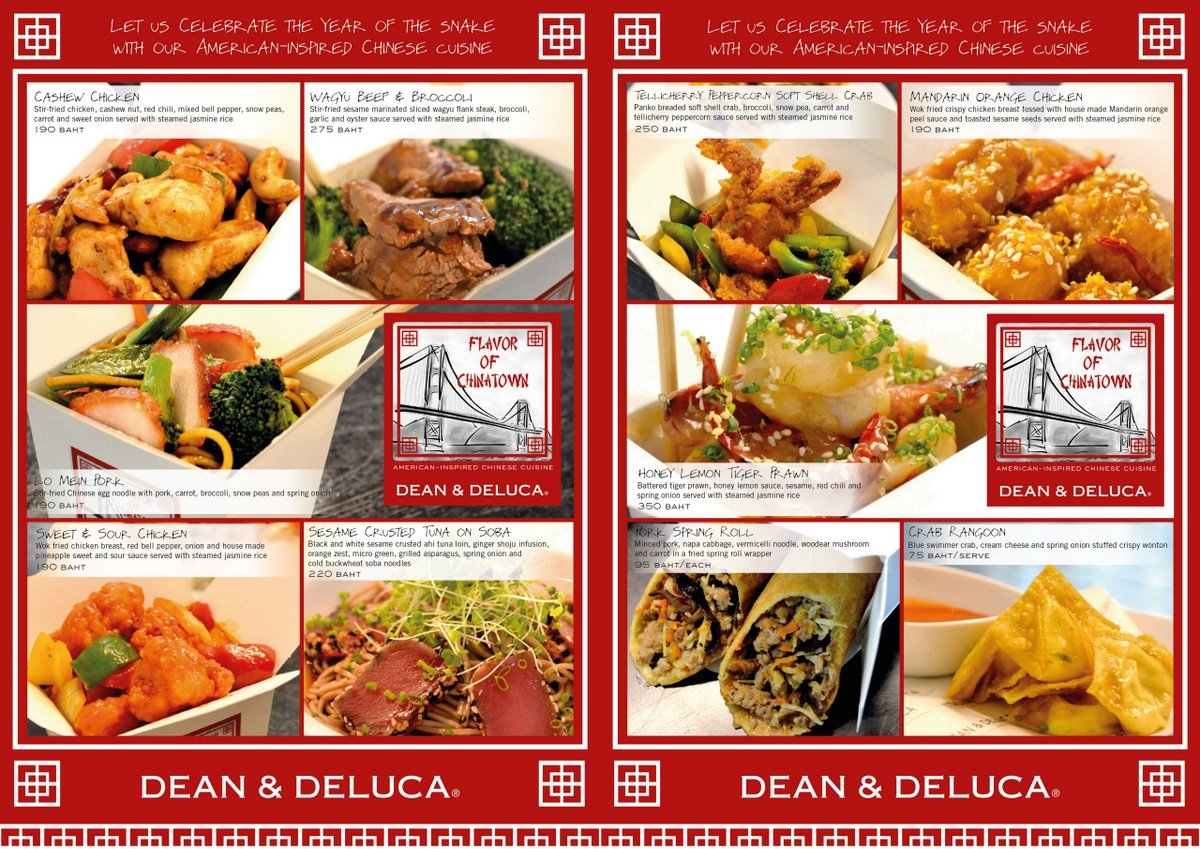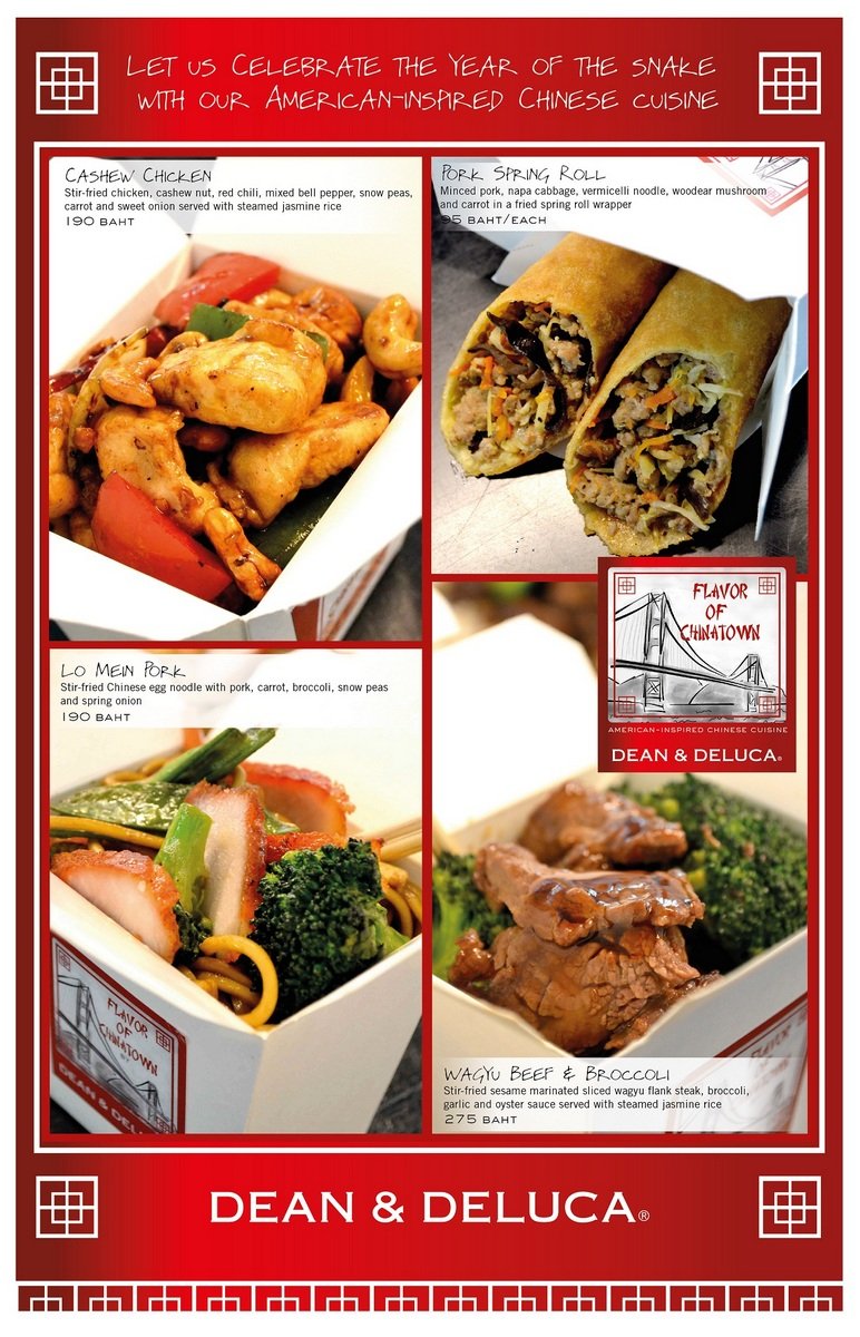 The Chinese Year of the Snake is approaching, and between January 7th and Chinese New Year on February 9th, Dean & DeLuca in Bangkok are serving up some delicious Chinese cuisine. Specially created by the Dean & DeLuca chefs, the menu features some of the most popular Chinese “take-out” style dishes that can be found in Chinatown eateries across the USA. Each dish is served in the typical take-out fashion- in a white cardboard folding carton- complete with fortune cookie.