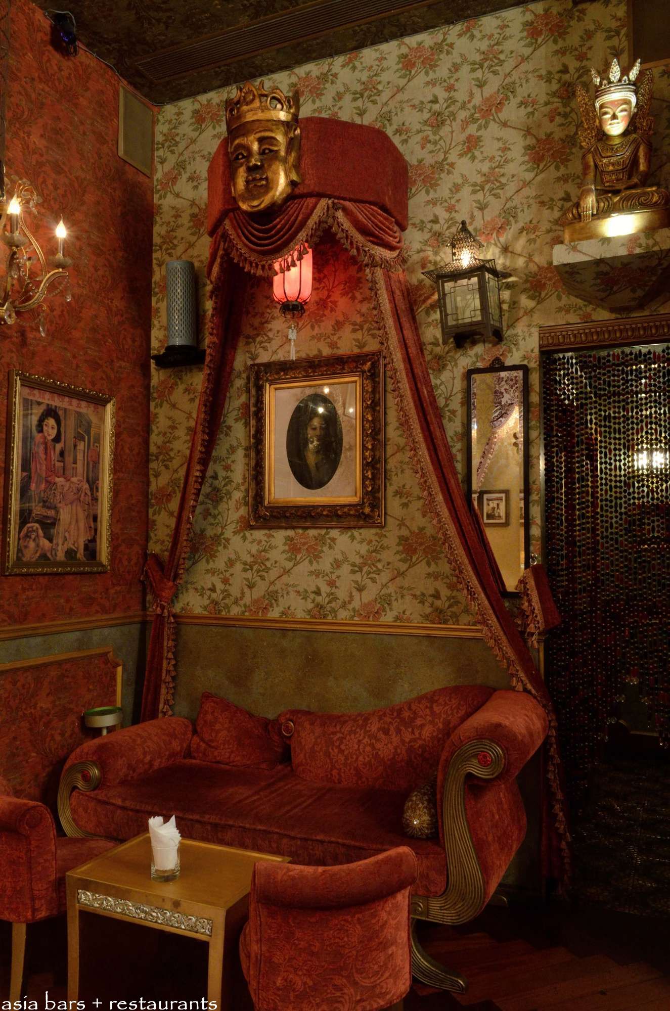 Le Boudoir is a delightfully conceived cocktail lounge in Hong Kong, evoking the seductive opulence and glamour of an 18th Century French palatial residence. Discretely accessed from a nondescript doorway on the bustling Wyndham Street in  the SOHO district of Hong Kong, the dimly lighted, red walled stairway opens into the basement room. An extravagantly decorated room, Le Boudoir is a late night haven for cocktail aficionados, or for a romantic rendezvous. The intimately scaled room accommodates an imposing central bar, with a couple of plush lounge settings, plus a few small tables for a discrete têt-à-tête. An exterior courtyard caters for smokers.