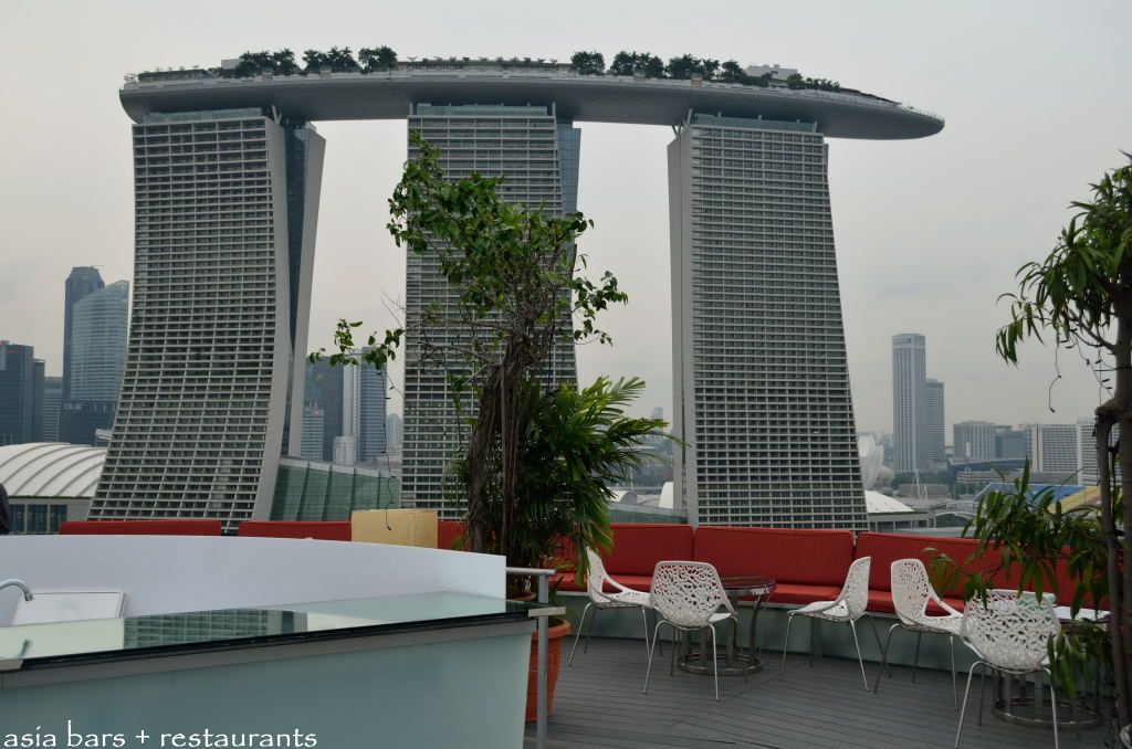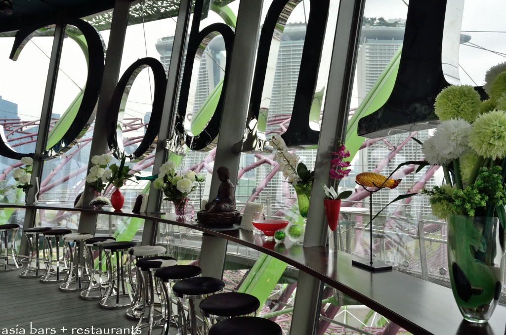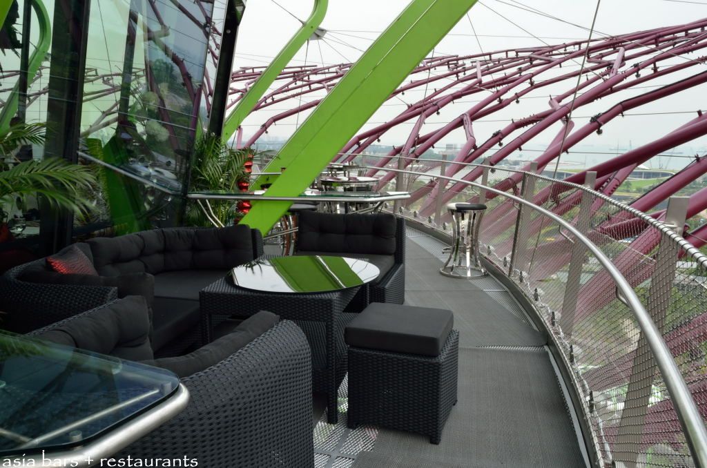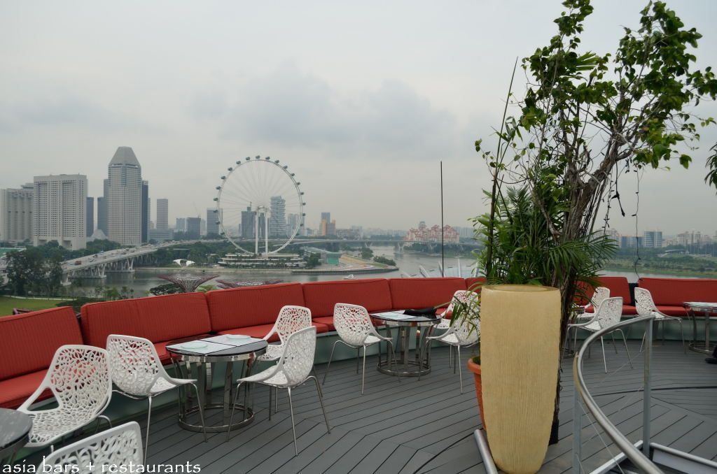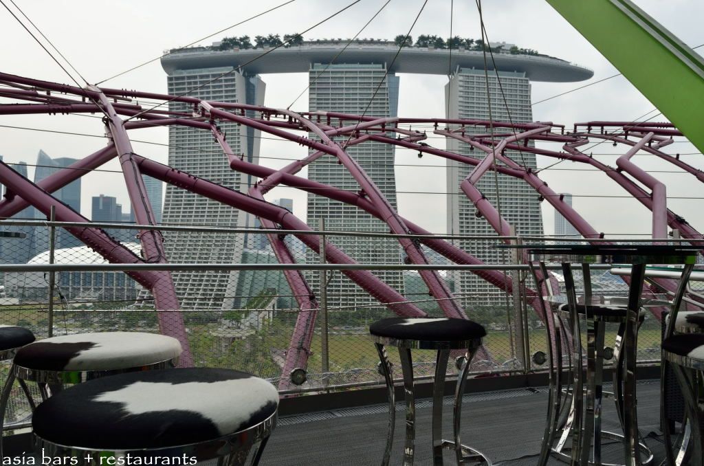 On the outdoor deck- facing back towards the Marina Bay Sands complex. Custom designed and fabricated bar stools and tables are shaped to mimic the profile of the SuperTree structure.