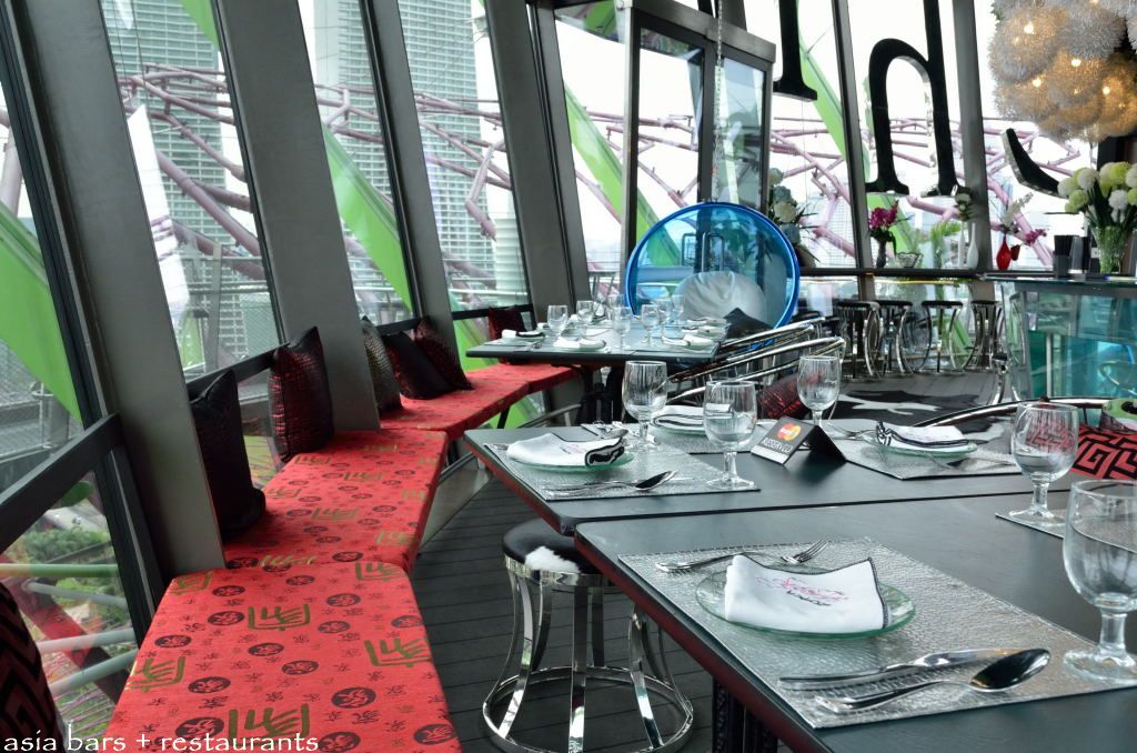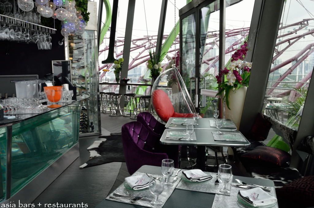 Guests on the rooftop deck enjoy unobstructed 360° views that encompass the skyscrapers of the CBD, the adjacent Marina Bay Sands, and to the south, the greenery of the ocean coastline. The views from the indoor lounge immediately below are no less impressive, and with full height glass enclosing the entire space- every table and seat has a clear view. The interior is styled as two themed hemispheres- Eastern and Western, with the custom-made decor and eclectic furnishings adding elements of glamour and luxury.