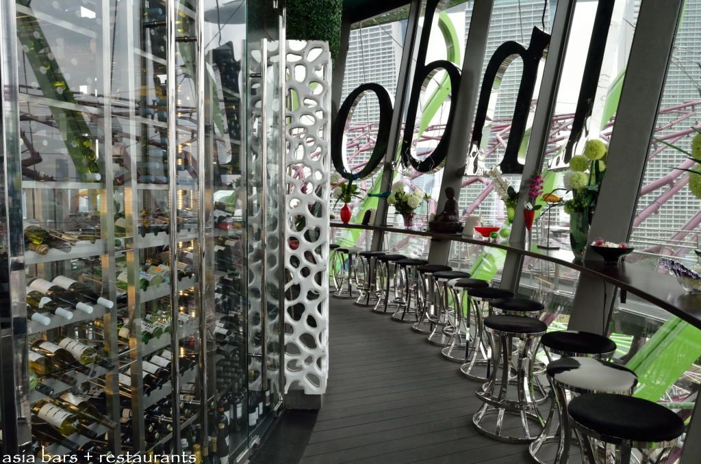 The glass fronted wine cellar- and opposite a long counter top wraps around the full height glass- offering great views across to Marina Bay Sands and the city skyline.