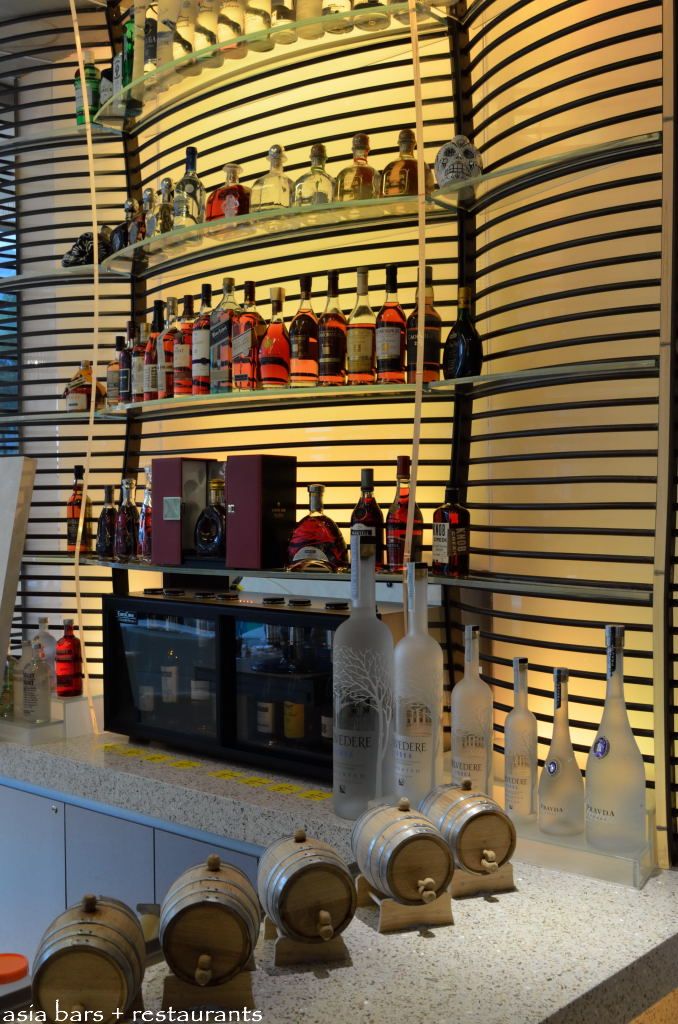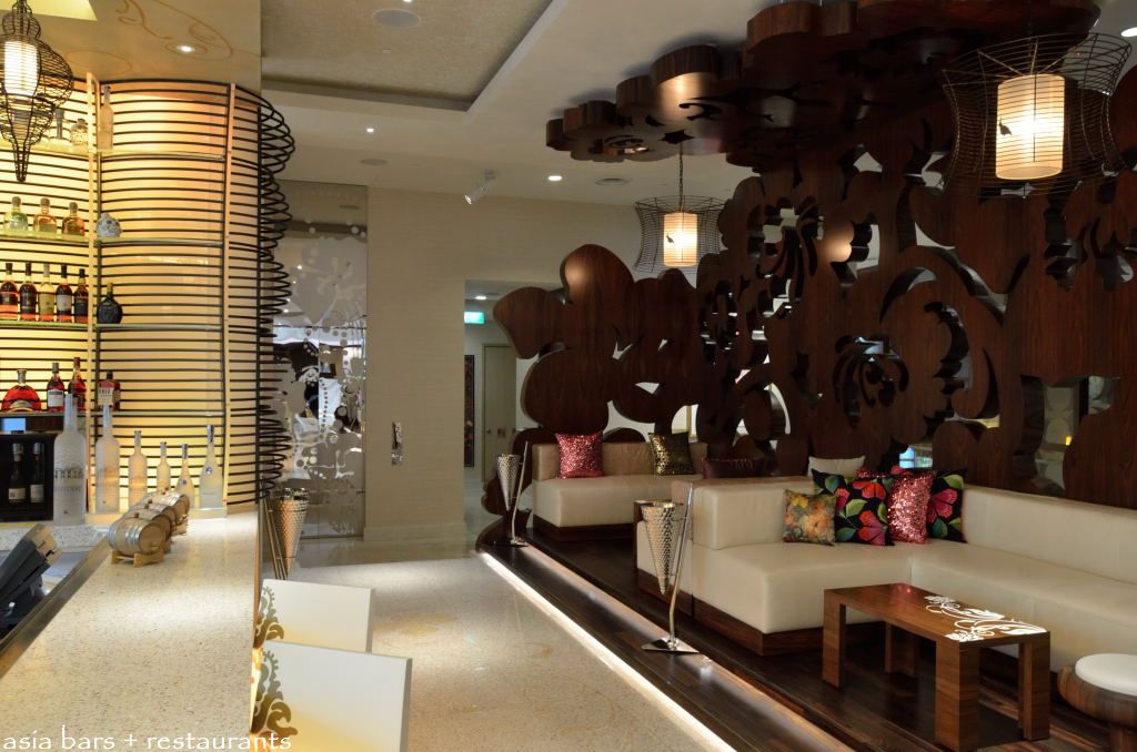 The upper section of the bar offers white leather upholstered chairs facing the bar counter, and luxurious lounge seating on a timber platform, back-dropped with a dramatic timber carving.