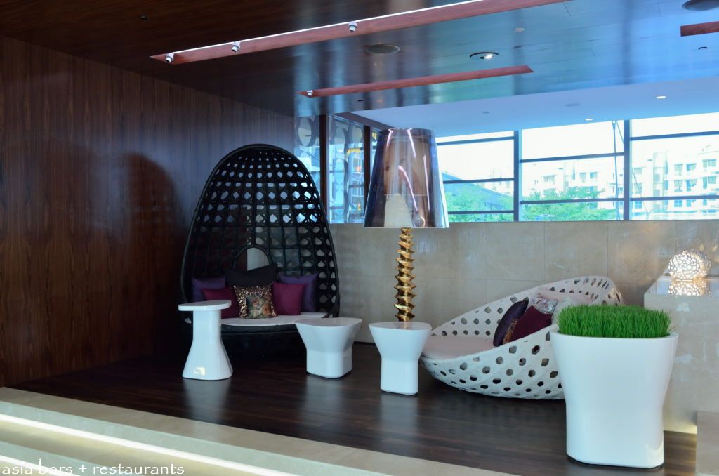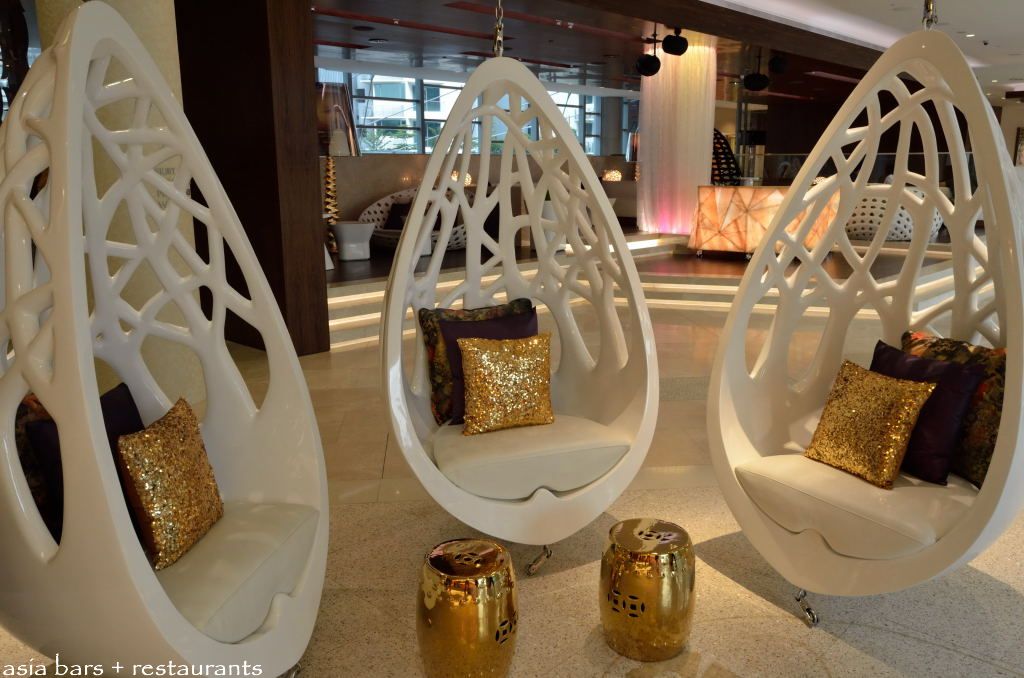 At the front of the main bar, suspended white “cocoon” chairs with sparkling gold cushions make a whimsical, bold design statement.