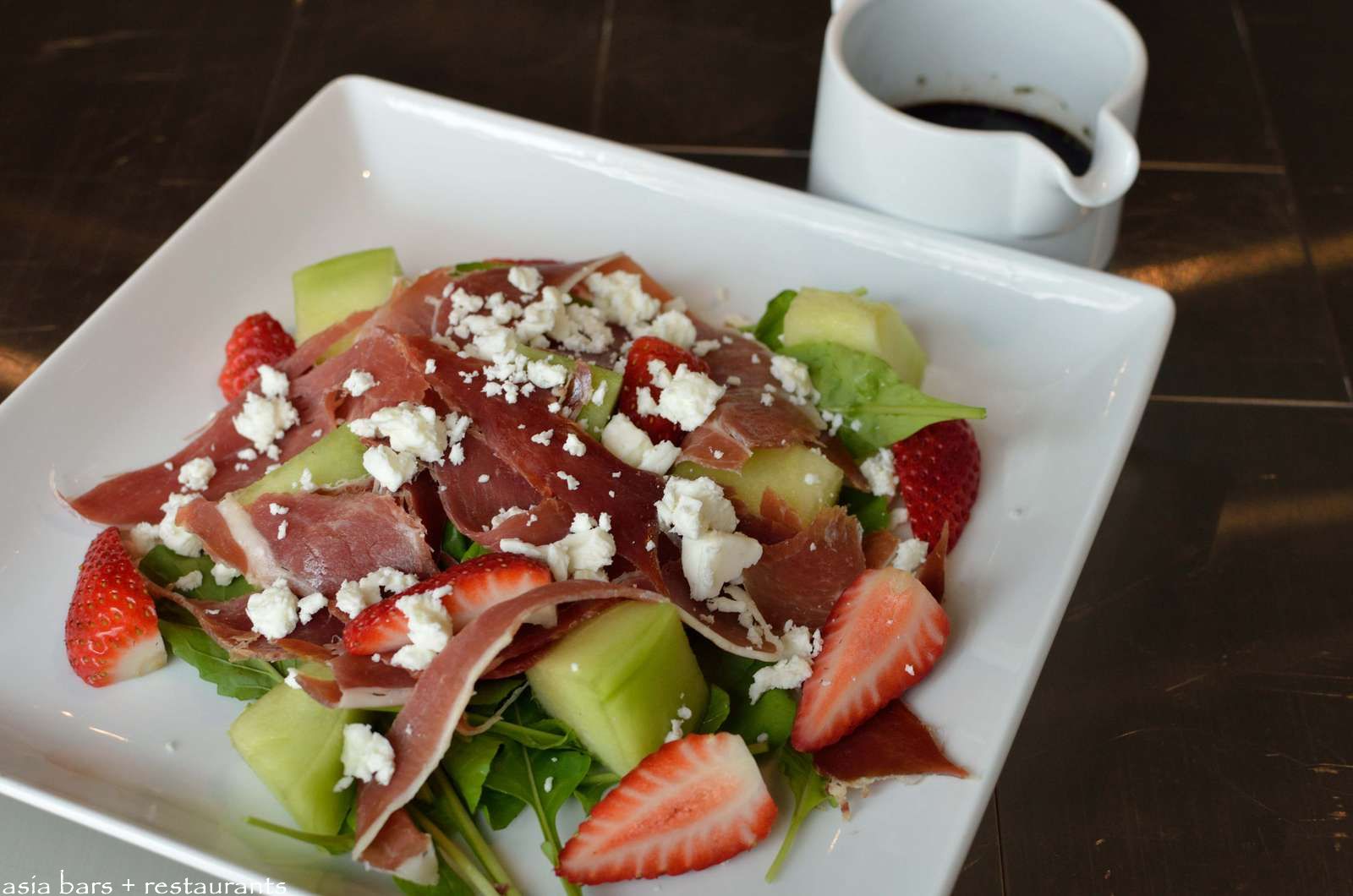 Fresh Honey Dew and Parma Ham Salad- with rocket leaves, fresh strawberry, feta cheese and honey balsamic dressing.