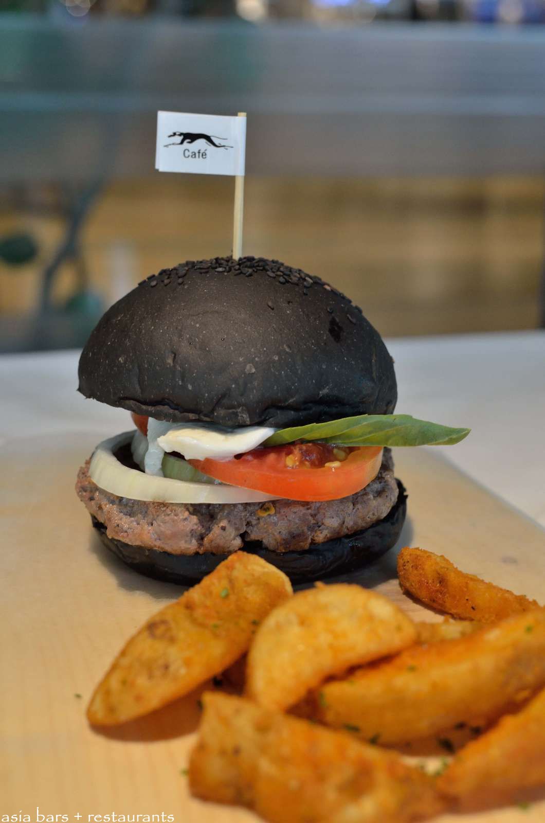 Buffalo Burger- Charcoal black bun made from squid ink, filled with grilled minced beef, fresh buffalo mozzarella, tomato and sweet basil. Served with Home Fries.