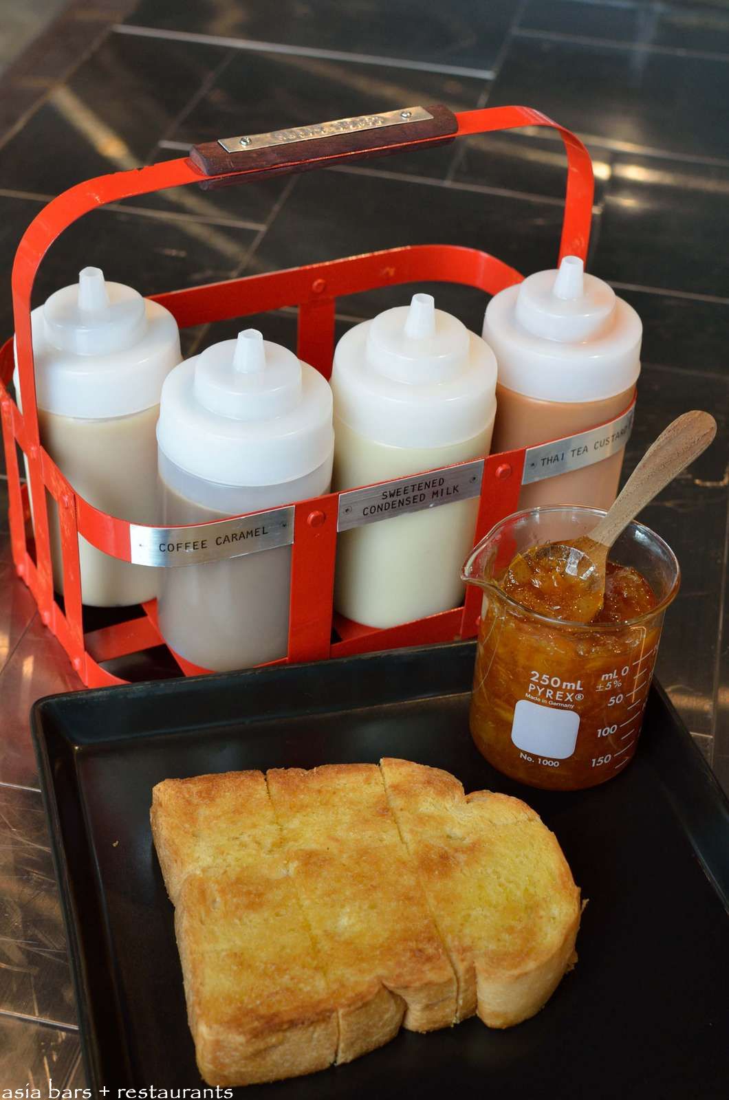 Happy Toast- Heavily buttered thick and chunky toast, served with 5 very tasty toppings- Thai Tea Custard, Sweetened Condensed Milk, Sea Salt Caramel, Coffee Caramel, & Marmalade.