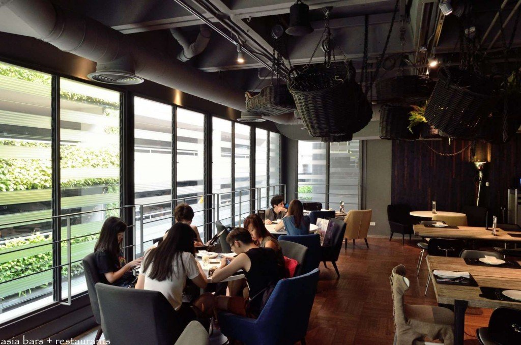 The main dining room has a glass facade overlooking the green vertical garden of the car park building. Sliding windows can open up the interior room to the fresh outdoor air.