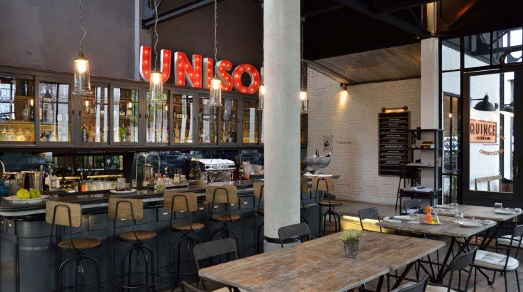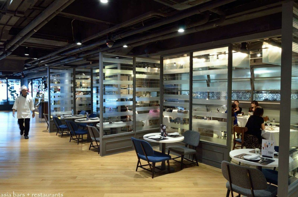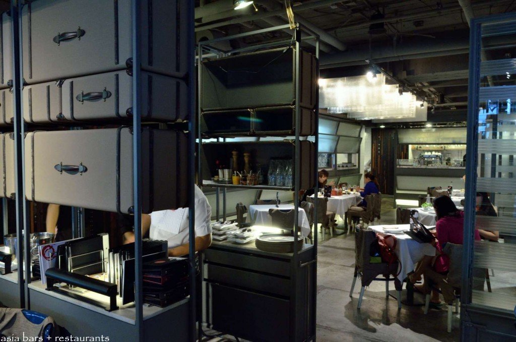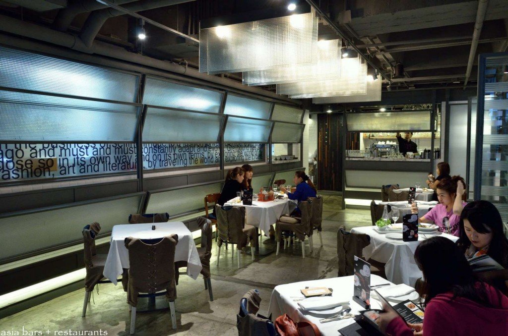 The front dining section features a pared-back industrial chic- concrete floors combine with industrial style glass, steel frames and comfortably spaced tables, topped with crisp white cloth. Dining chairs also feature their own “clothing” as covers.