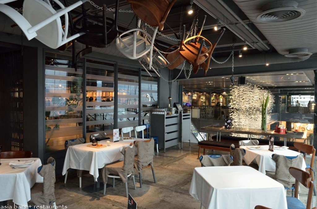 The third dining section in the corner also can function as a private dining or events room. Full height glass provides an outlook over the adjacent Siam Tower.