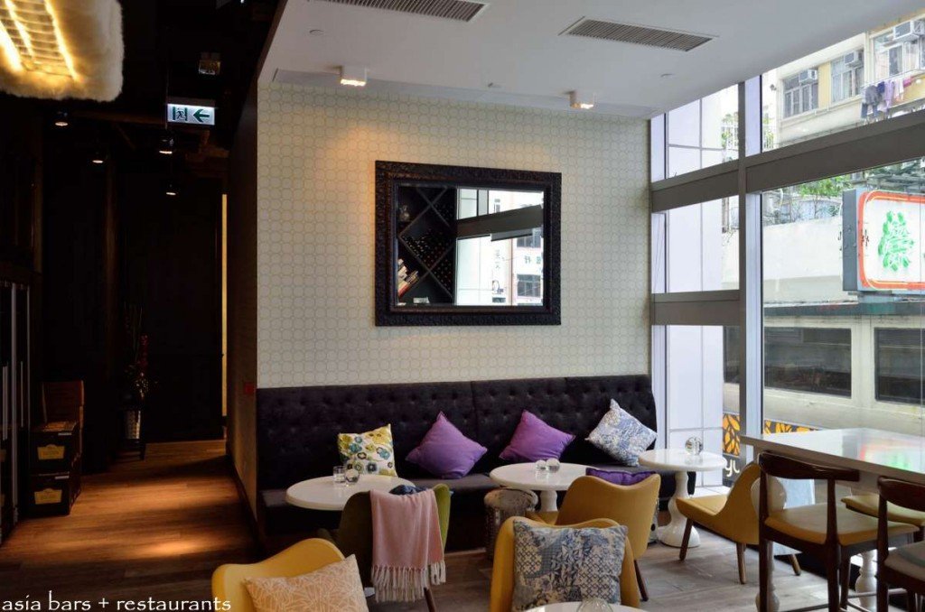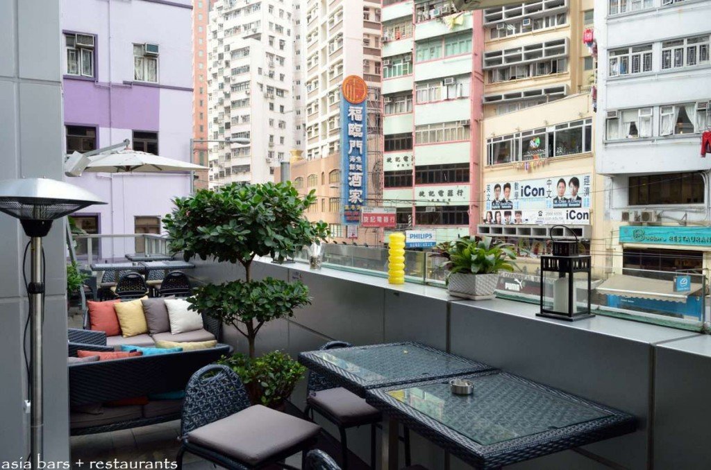 The outdoor terrace offers a casual setting for dining or drinks immersing guests into the buzz of Wanchai street life.