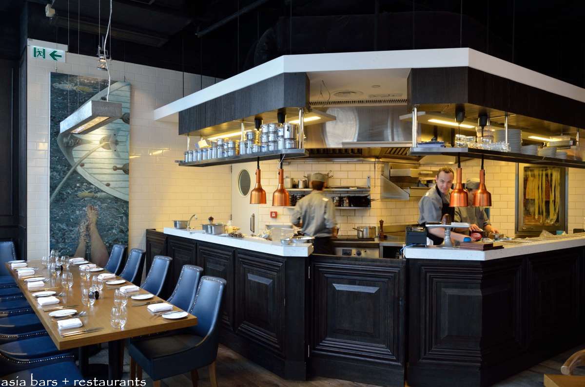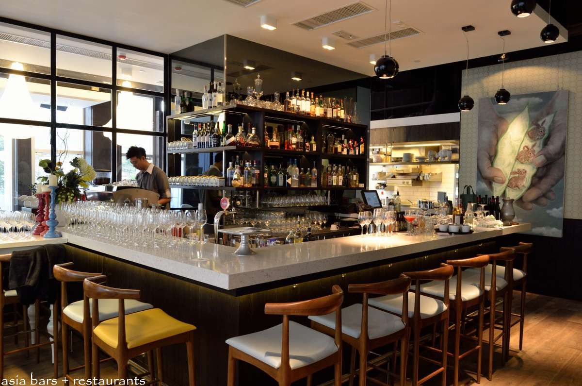 The sleek cocktail bar stands between the restaurant entrance and the dining room and kitchen.